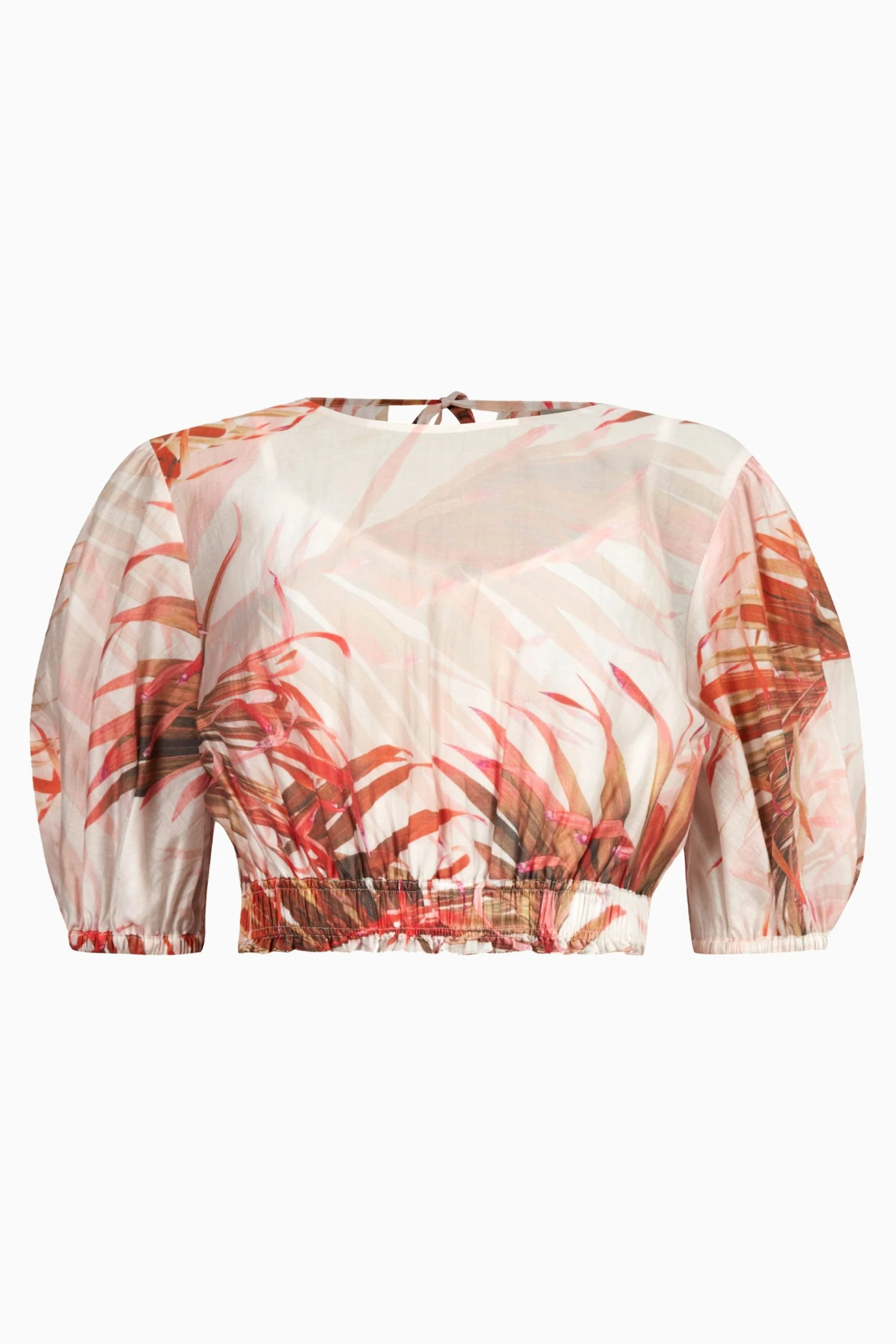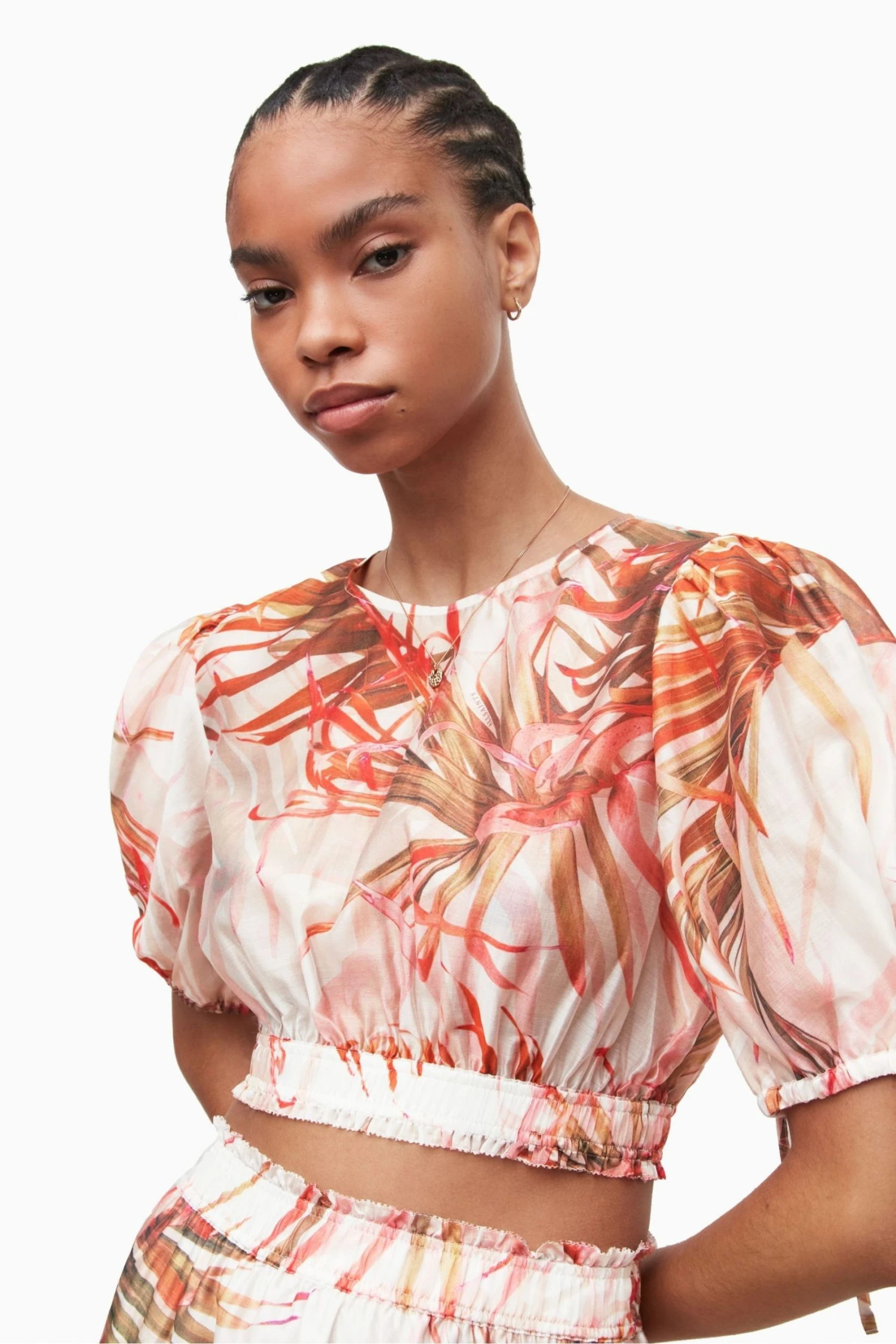 Pull over. Regular fit. Short length. Crew neck. Printed cropped top. Back neck tie detail. elasticated waistband with a frill edge finish. Short sleeve with an elasticated cuff.
