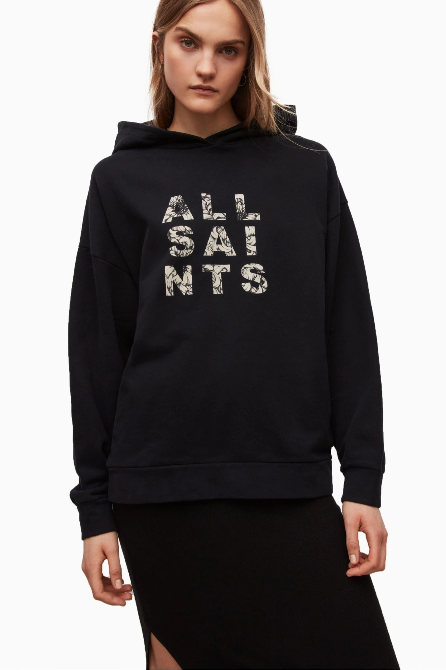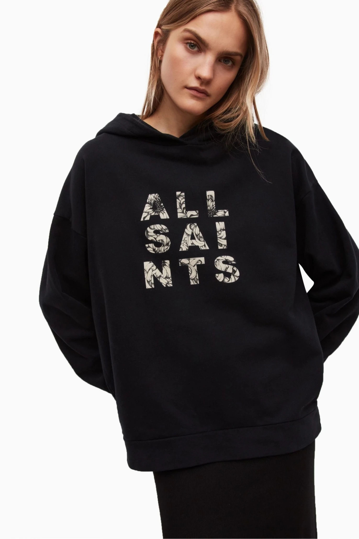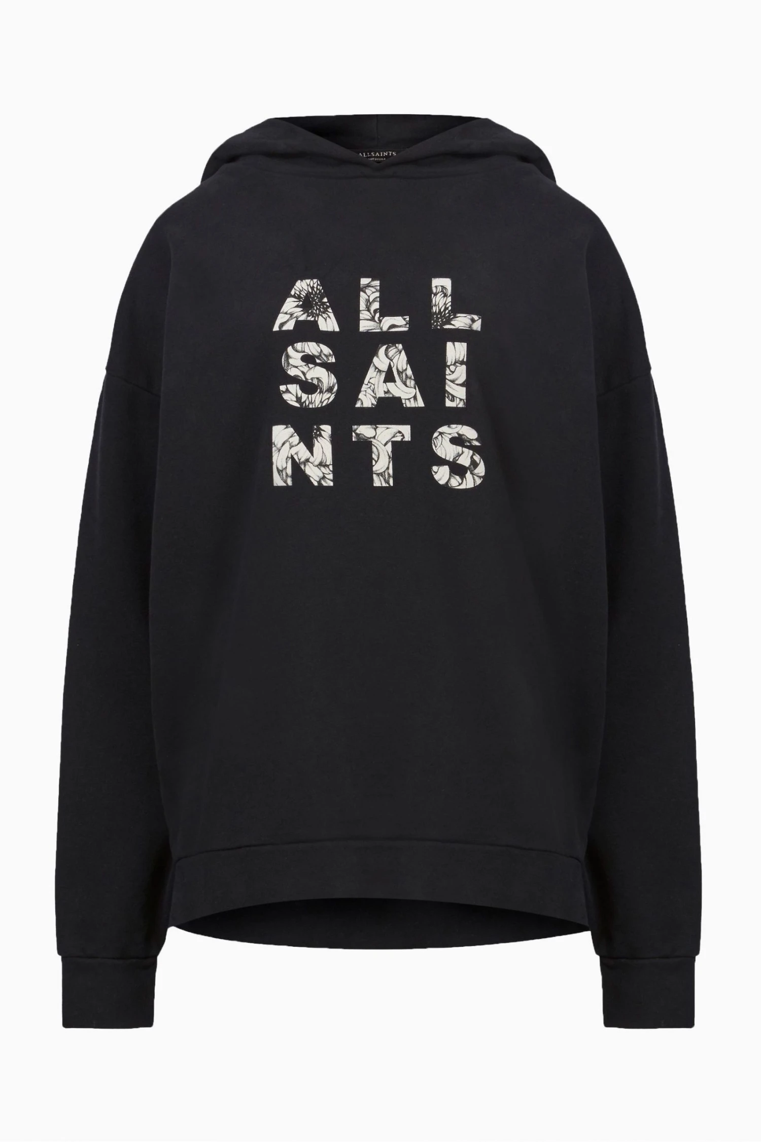 Pullover. Hoodie. Long sleeve. Ribbed hem. Chest graphic. ALLSAINTS cotton products support more sustainable cotton farming. Better Cotton is sourced via a system of Mass Balance. Relaxed fit.