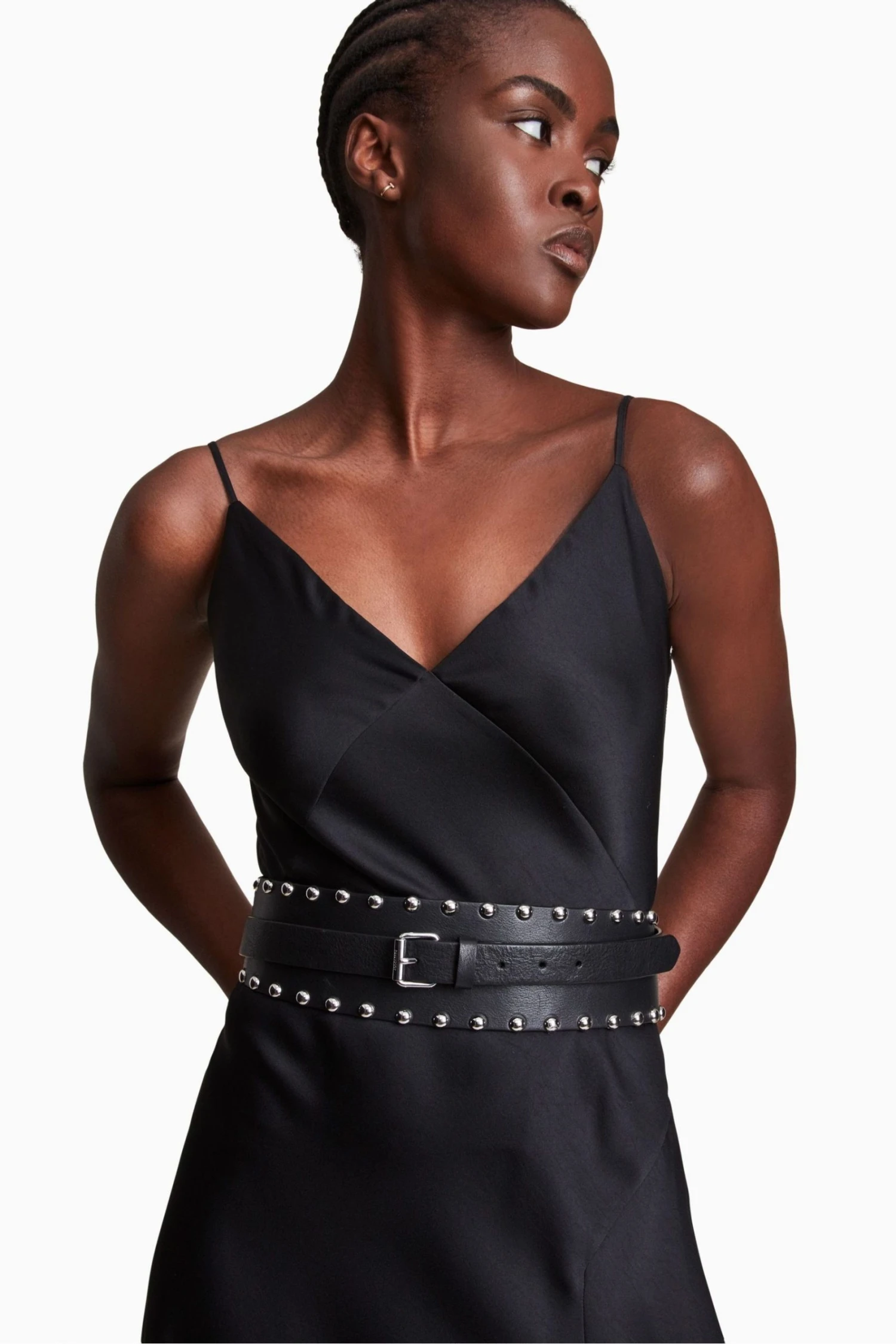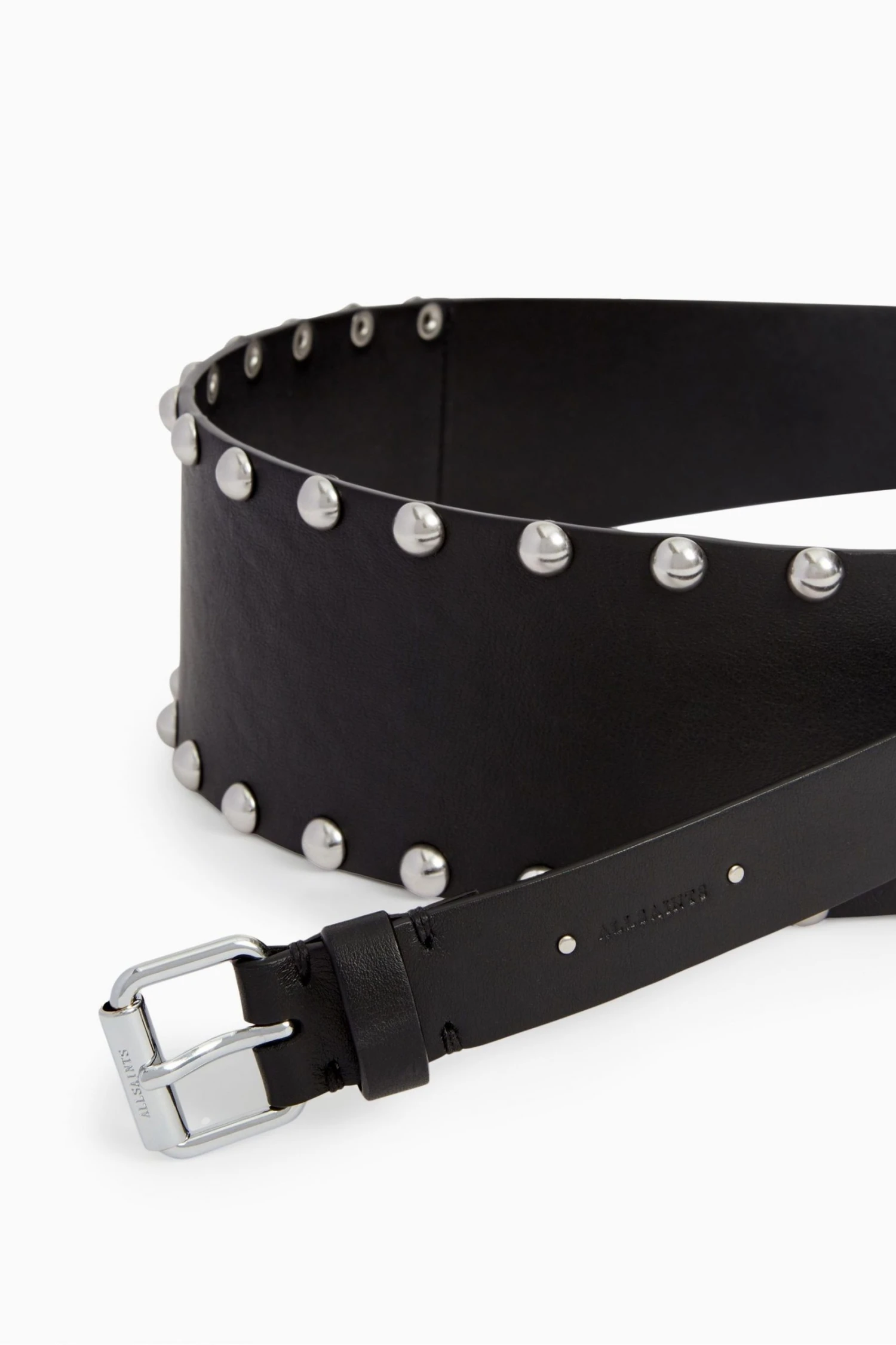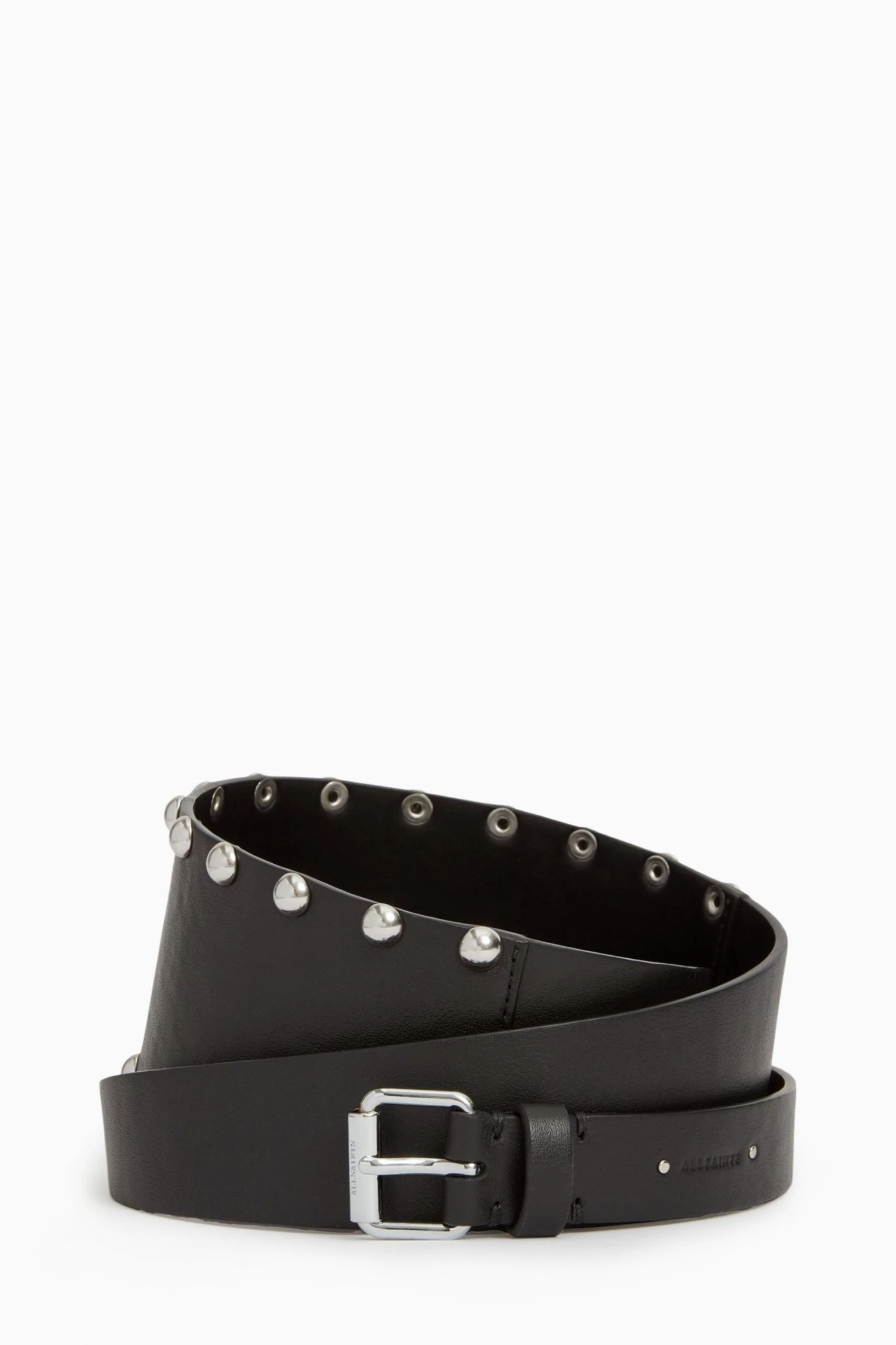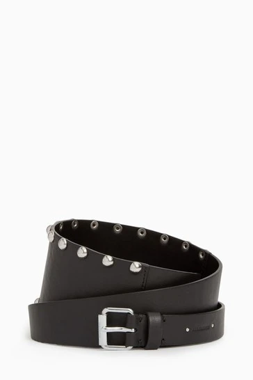Featuring waist belt, studded, five holes and roller buckle. Width: 25mm – 75mm. XS/S: 155cm, S/M: 170cm, M/L: 185.5cm, L/XL: 200.5cm.