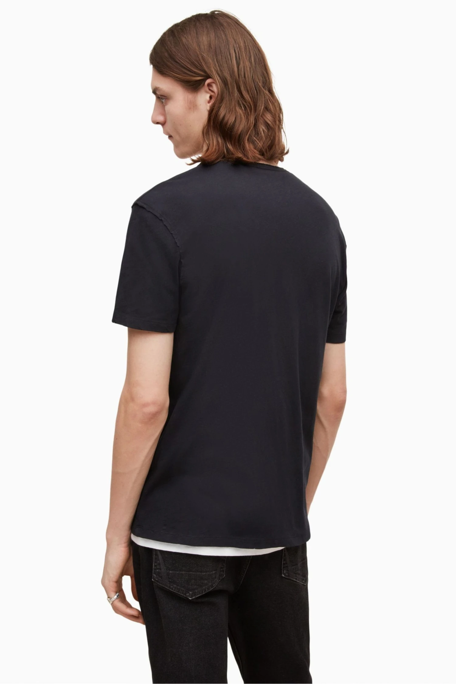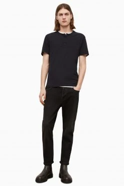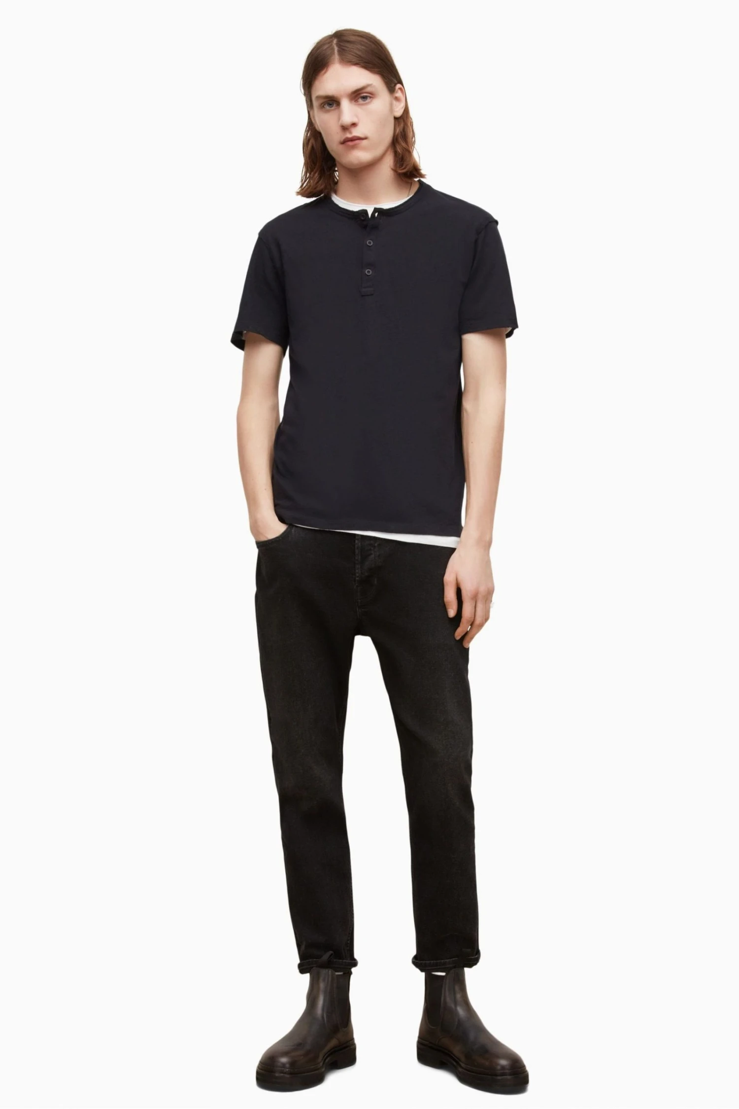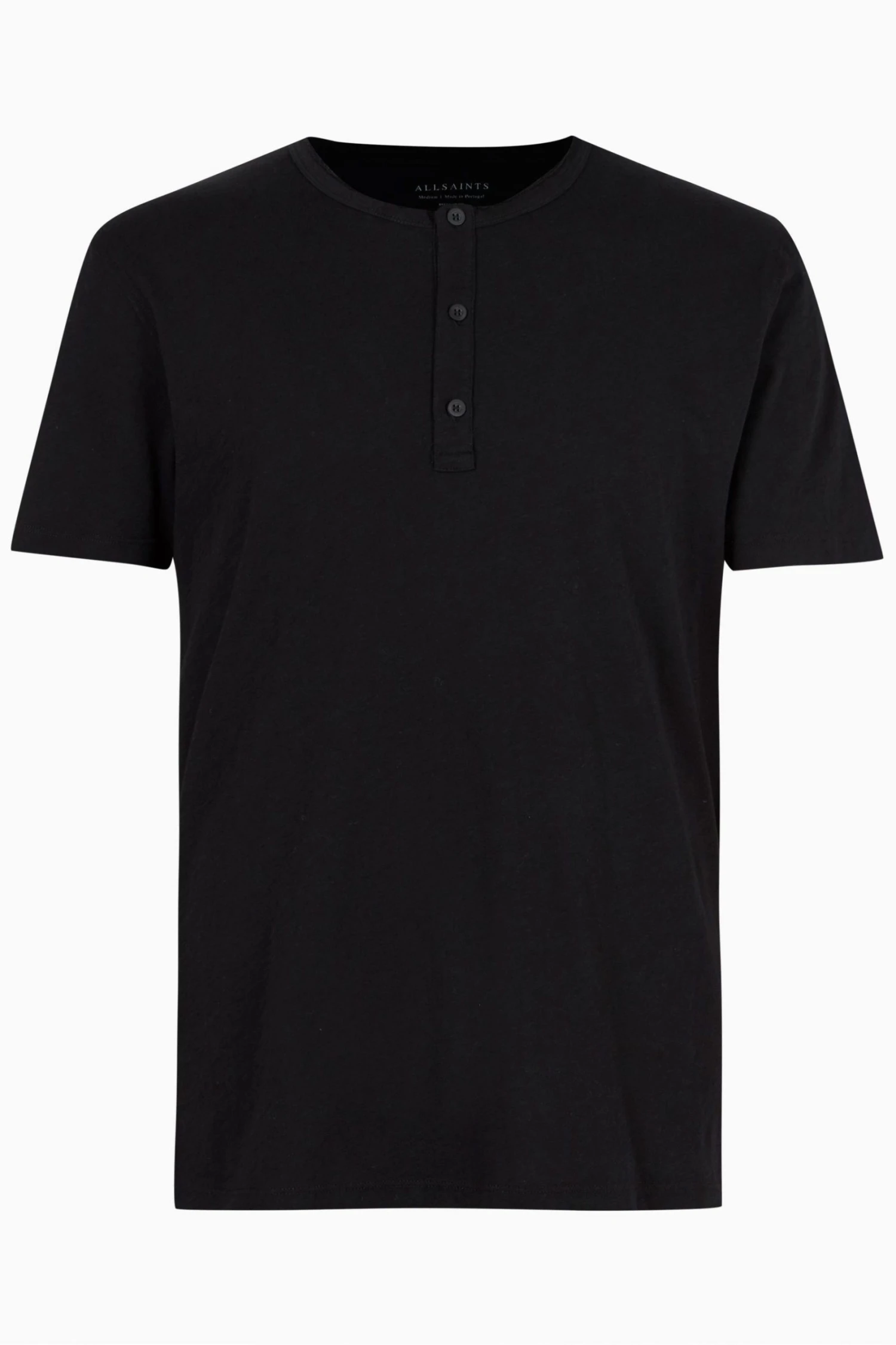 Slim fit. Crew neck. Short sleeve. Raw edge finish on armholes and neckband. Placket with three button closure.