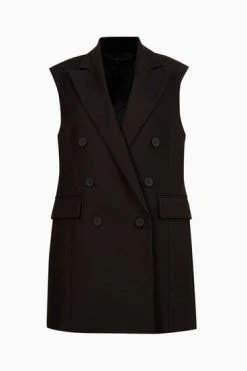 It’s a double breast and relaxed fit jacket. Sleeveless design. Designed with collar, short length. Featuring straight silhouette with peak lapel, two flap pockets and matt black buttons, one internal pocket and made with branded jacquard lining.