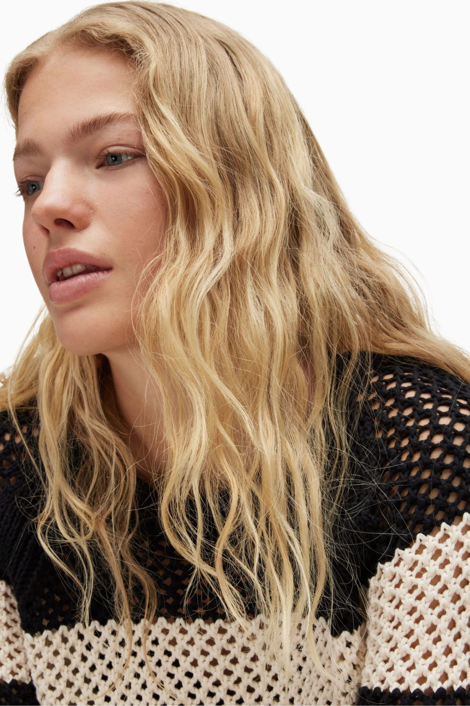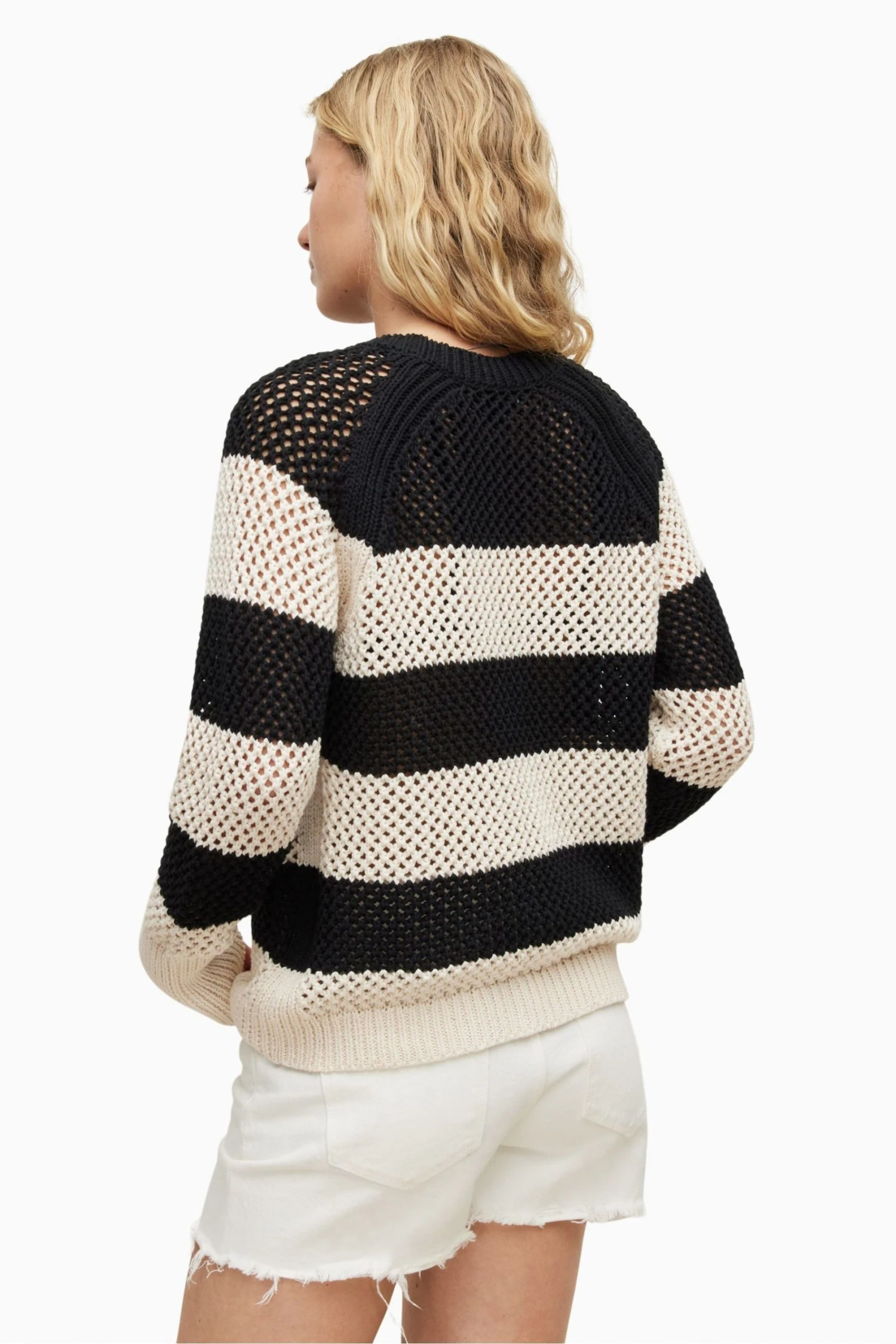 It is pull over. Desgined with crew neck, long sleeves, open mesh stitch. Featuring nold block strips, raglan sleeve, and deep rib cuffs.