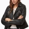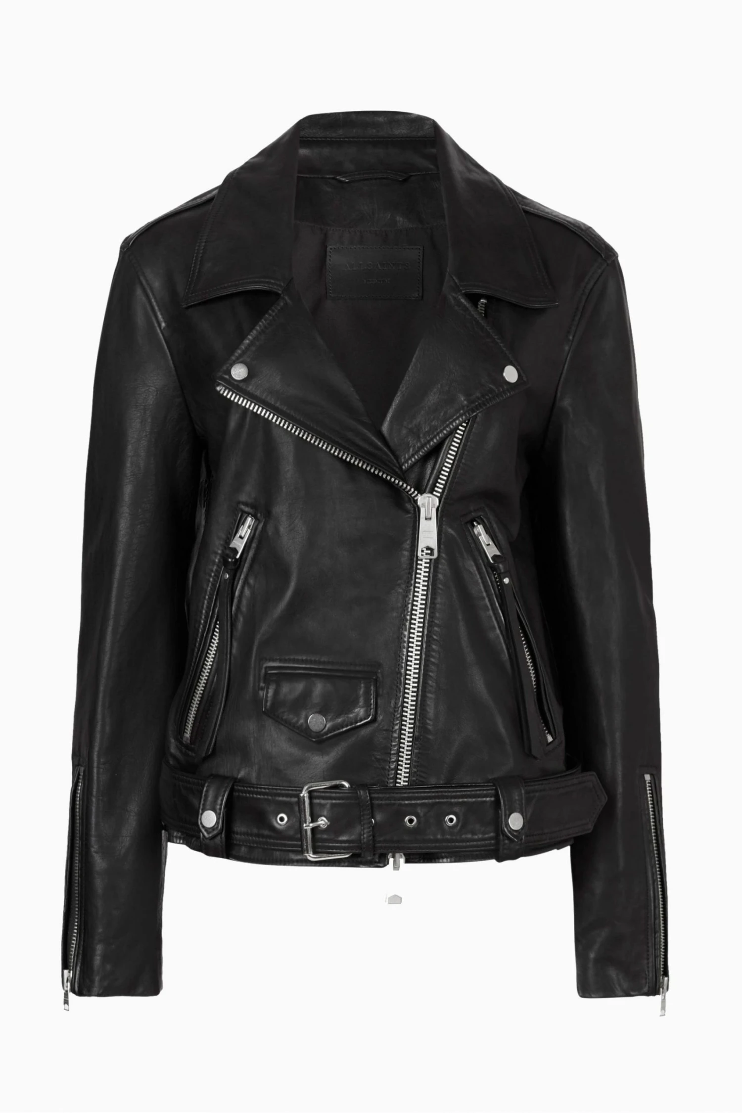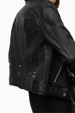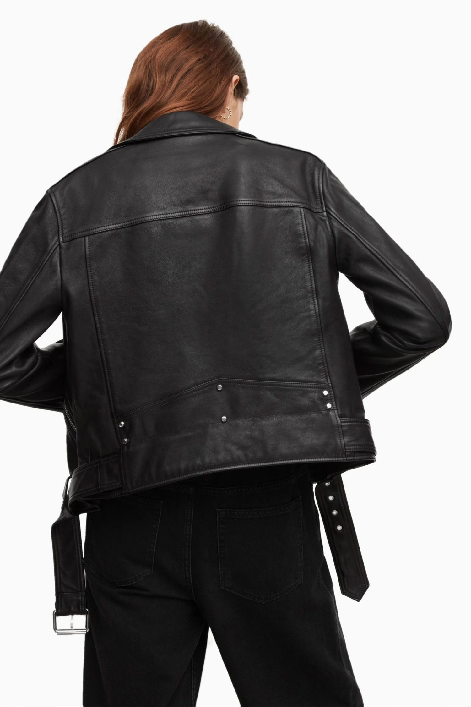 Oversized leather. We love it. The Luna. A move on from your favourite Billie Biker Jacket. Crafted from smooth leather. Heavily washed and tumbled. For a high-low effect. With metal hardware to complement. Zip closure. Long sleeve. Dropped shoulders. Three pockets. Snap ticket pocket. Removable belt. Dull nickle hardware. Inspired by the Billie Biker. Drum dyed semi-vegetable tanned leather. Heavily washed and tumbled. 60% of wastewater is reused during the processing of the leather used to make this style. Model is 5’7″/175cm and is wearing size Medium. AllSaints leather products support responsible manufacturing via the Leather Working Group.
