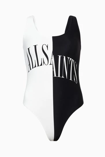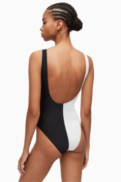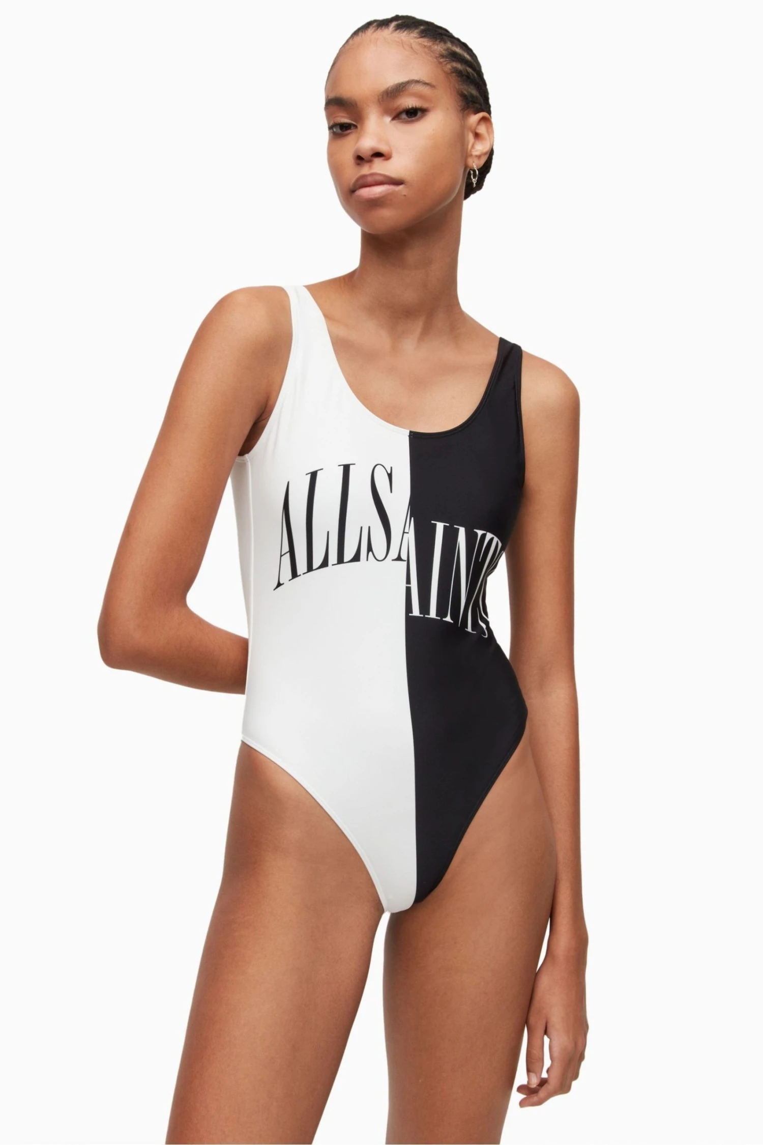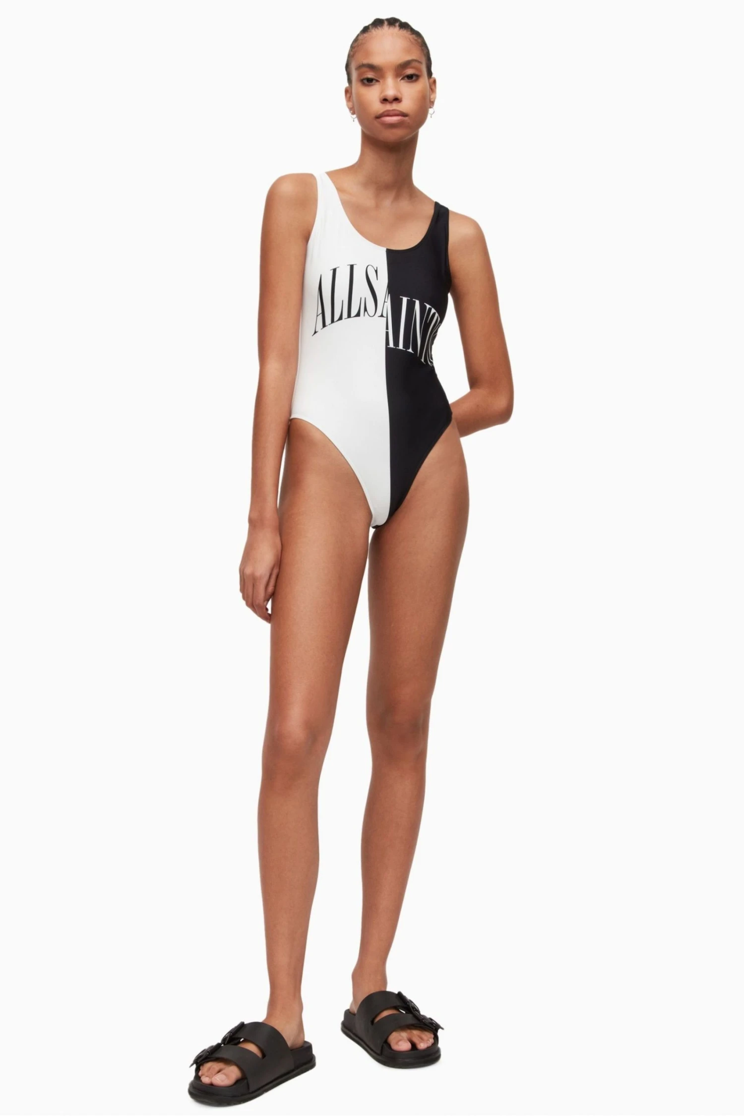 Slip on. Regular fit. simple swimsuit shaping with chunky straps. low scooped neckline and flattering low cut out on the back. Swimsuit feature our split saints graphic in bold black and white contrast ( swimsuit if half white/ half black)