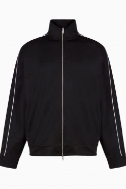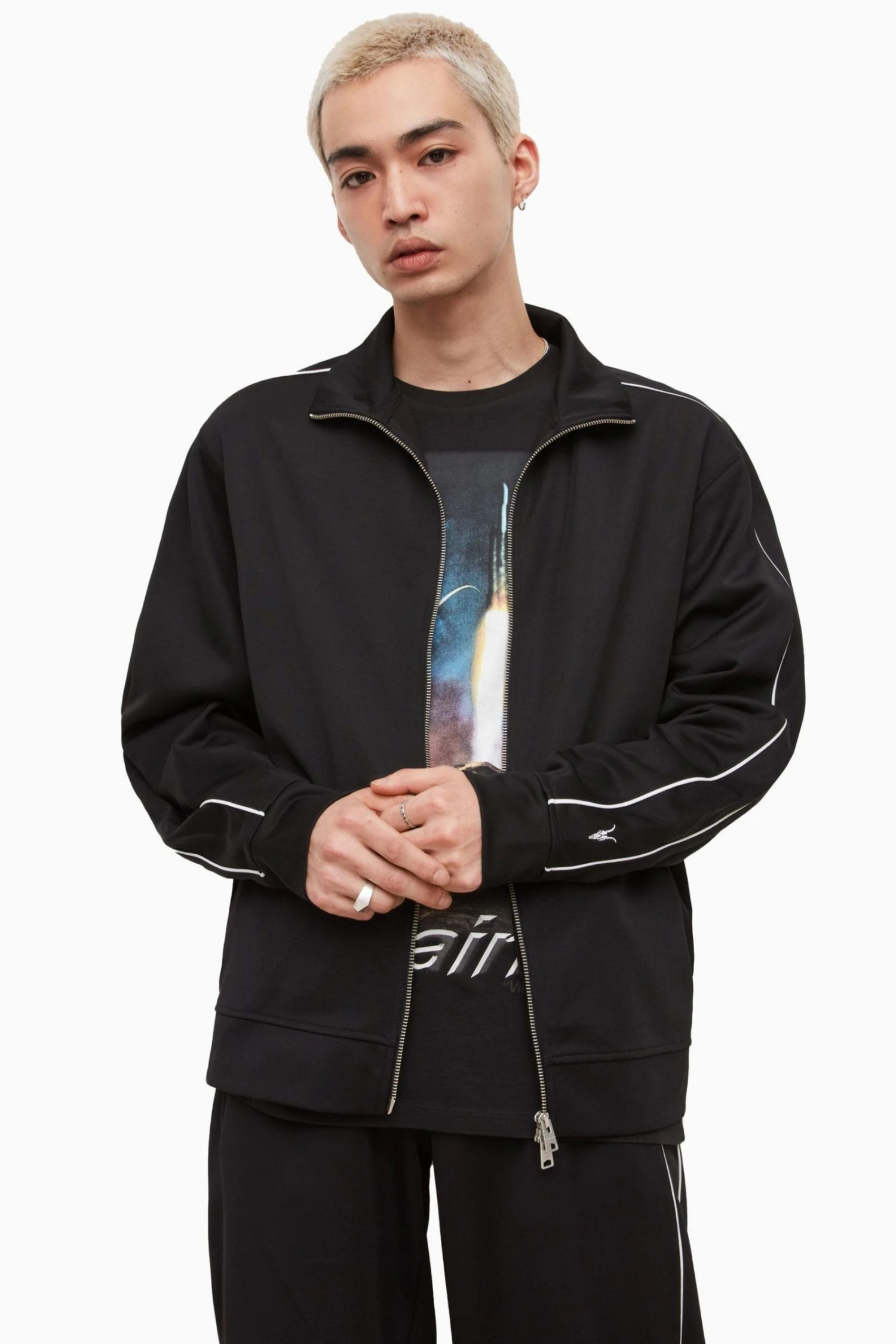 Featuring sleeve panel with contrast colour piping insert, self fabric collar, cuffs and waistband, zip closure, welt pockets, and Ramskull embroidery on left sleeve hem.