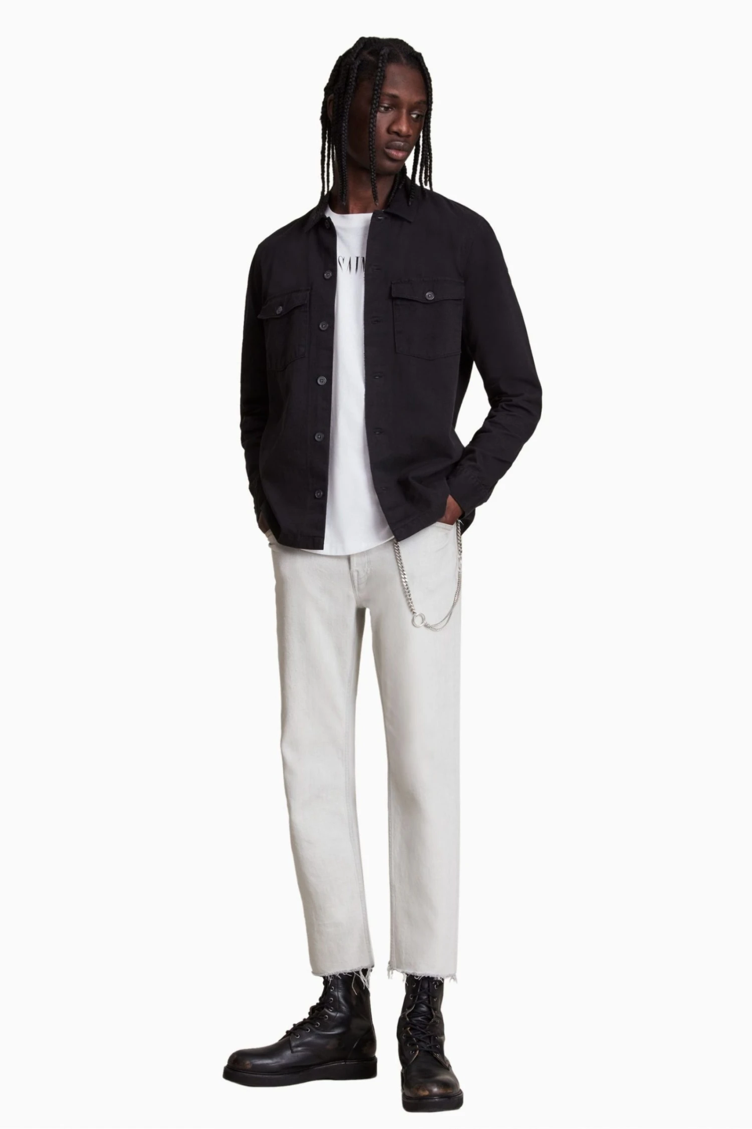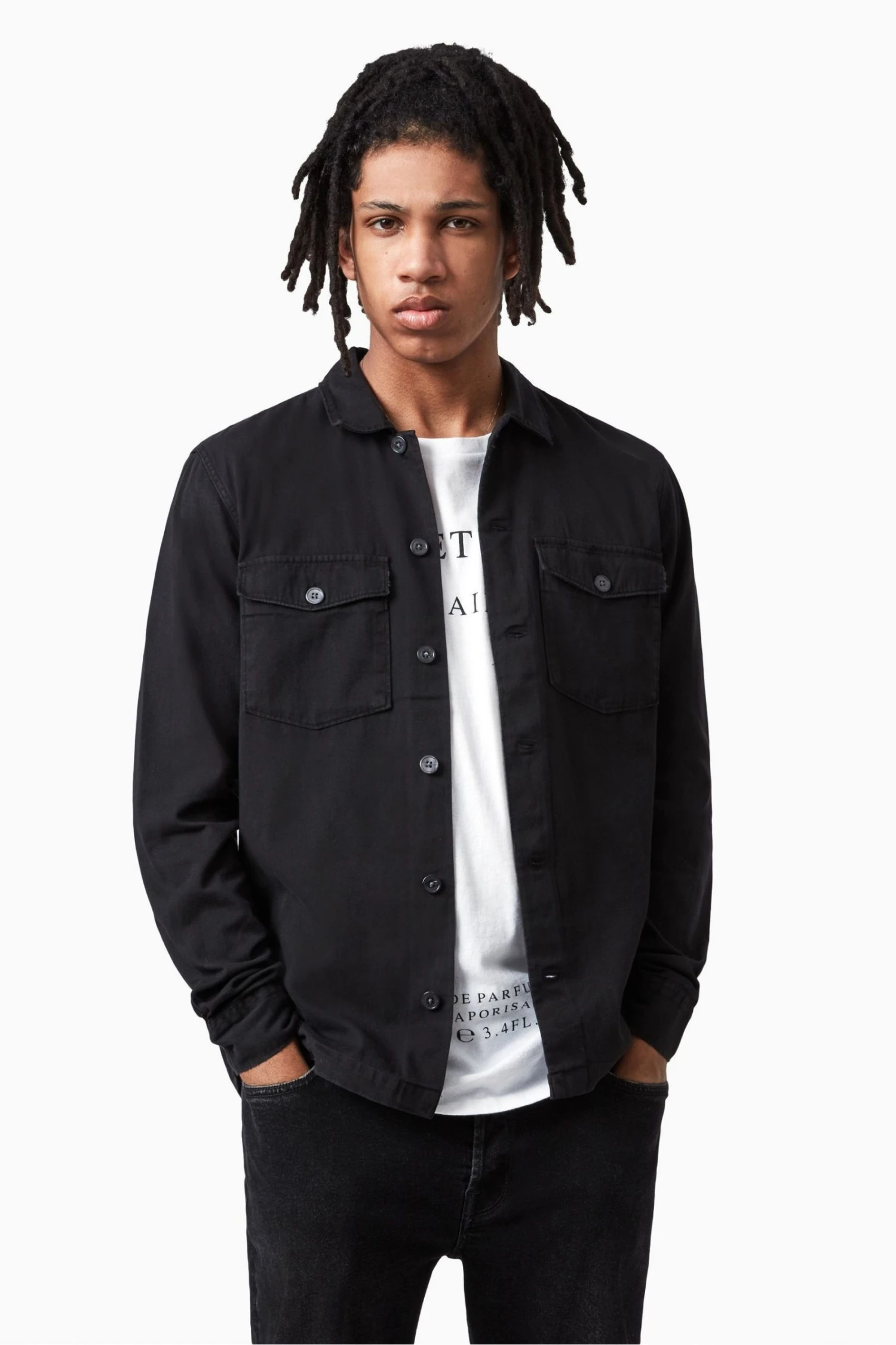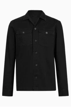 Long sleeves. Button up closure. Camp collar. Chest pockets. Chipped metal buttons.