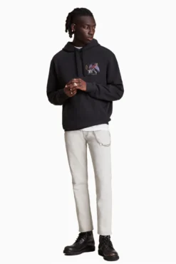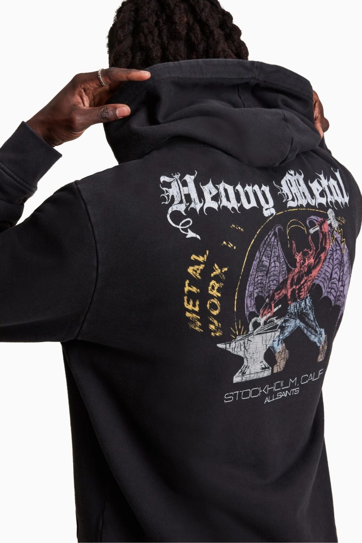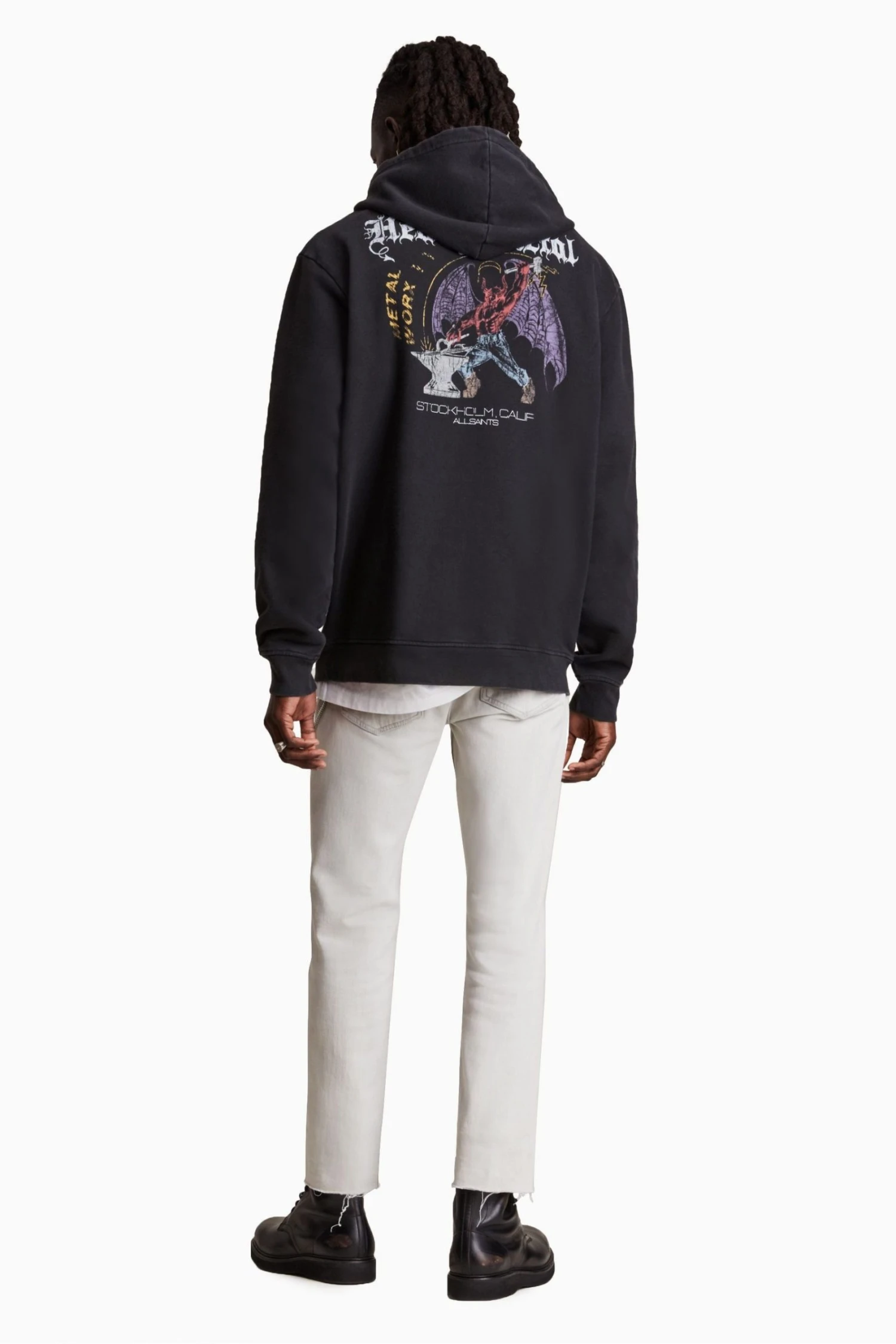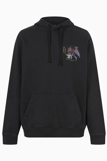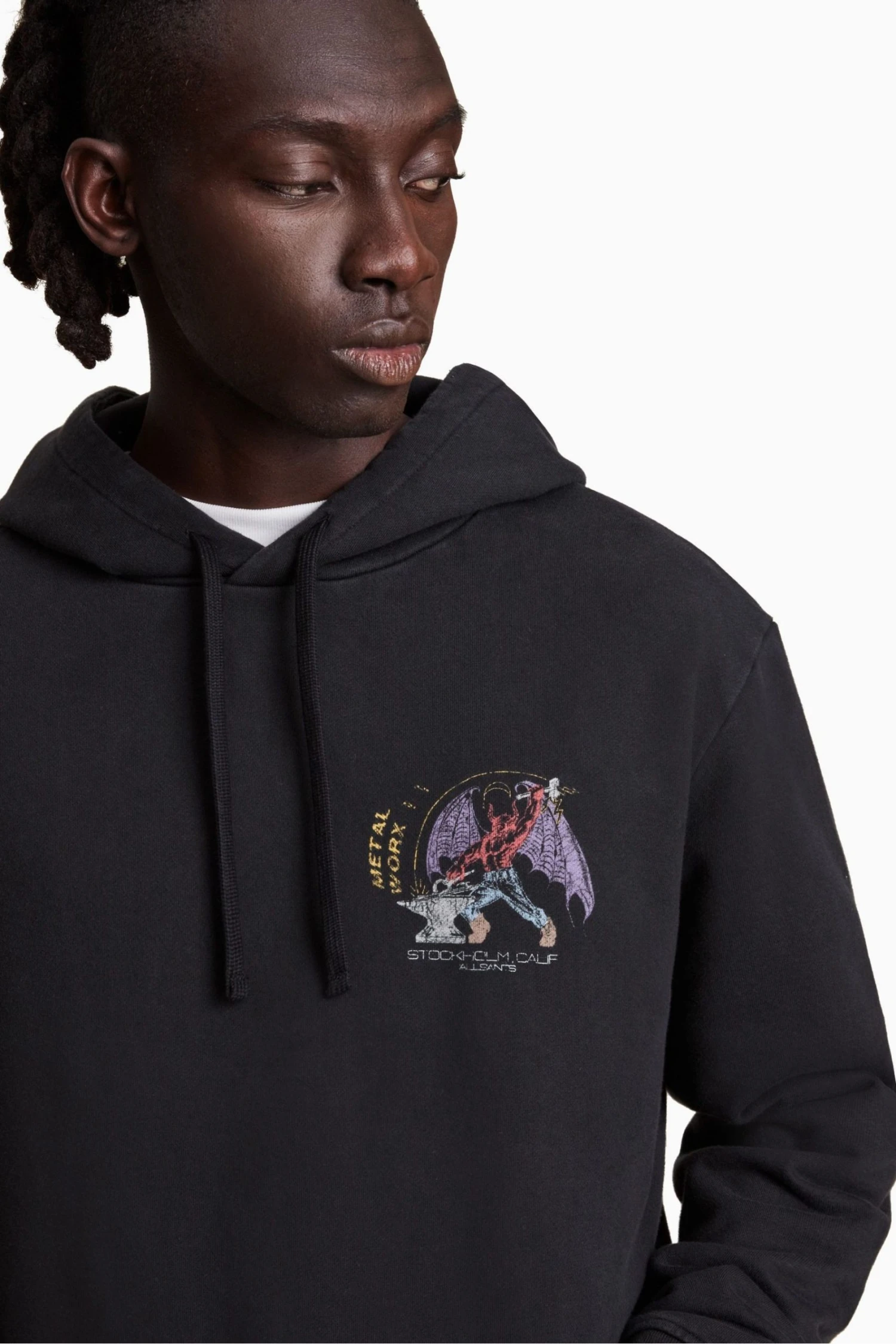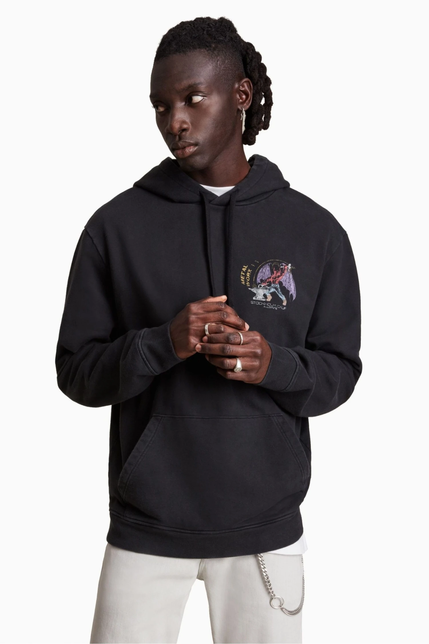 Featuring pullover, hoodie, kangaroo pocket, long sleeve and hand drawn graphic on the chest and back.