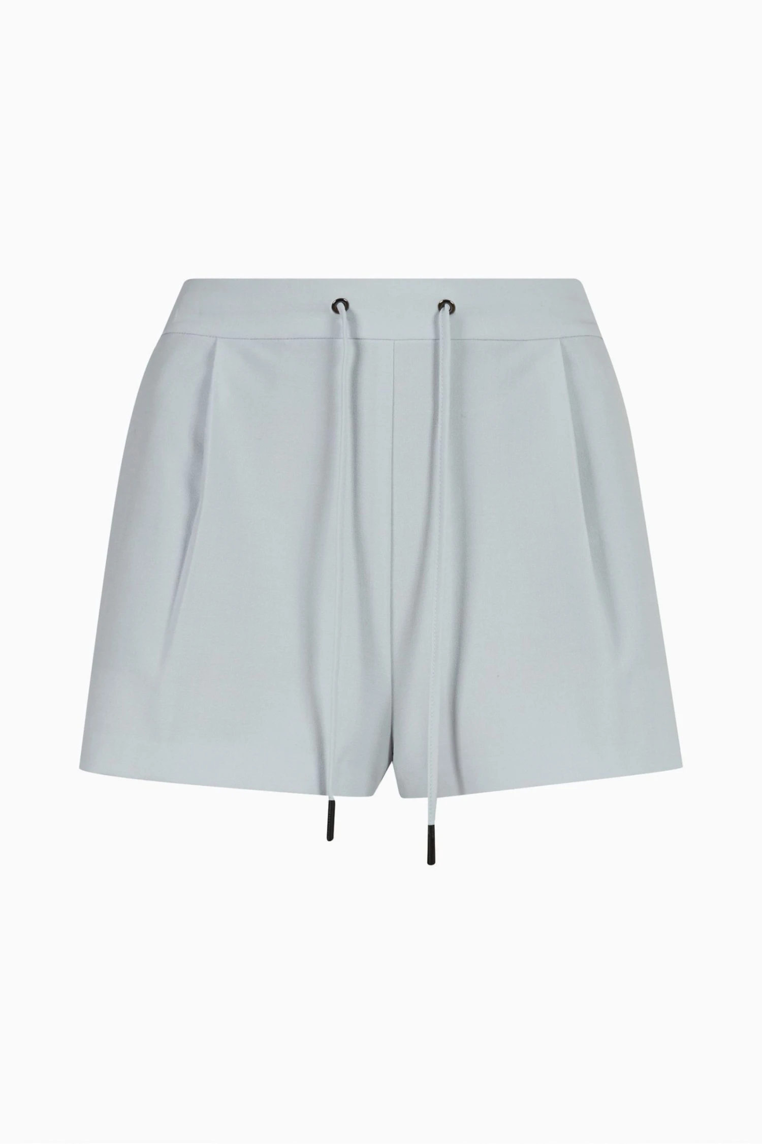 Featuring a pull-over design, short length, drawcord waistband, side pockets, pleat at the waist and back welt pockets, mid rise, straight leg and unlined.