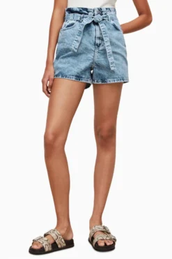 Featuring button closure, ultra high rise, paperbag shorts, elasticated waistband, self fabric belt, finished hem, five pockets and straight leg.
