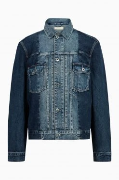 Button closure. Relaxed fit. Collar. Long sleeves. Patchwork inspired jacket, the body has two different shades of indigo wash to give the impression of two separate jackets sewn together. Sleeves and 1/2 the front body are in dark indigo with the centre of the body in a mid indigo level. Type two jacket styling so has the front pleats. Pockets to front chest with button closure. Small corner of a pocket sewn under left chest pocket to again add to patchworking inspiration. Front yoke seam is offset chest pockets with button fastening.