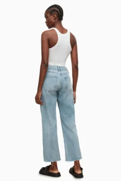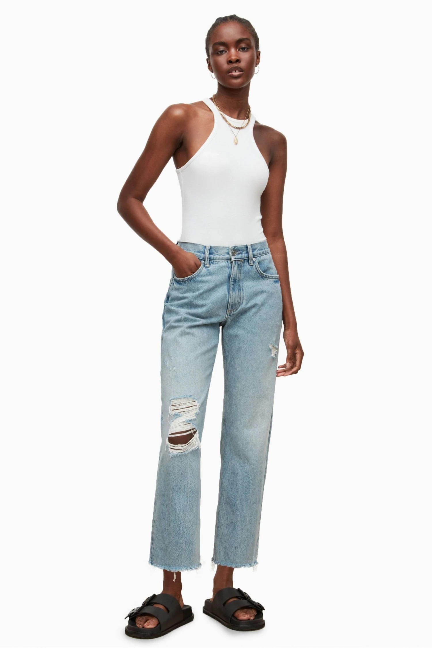 It is relaxed fit, designed with zip closure, high-waisted and straight let. Destroys on the knees. Features, two front pockets and one coin pocket on the right and two patch pockets on the back and finished hems.