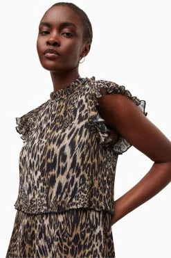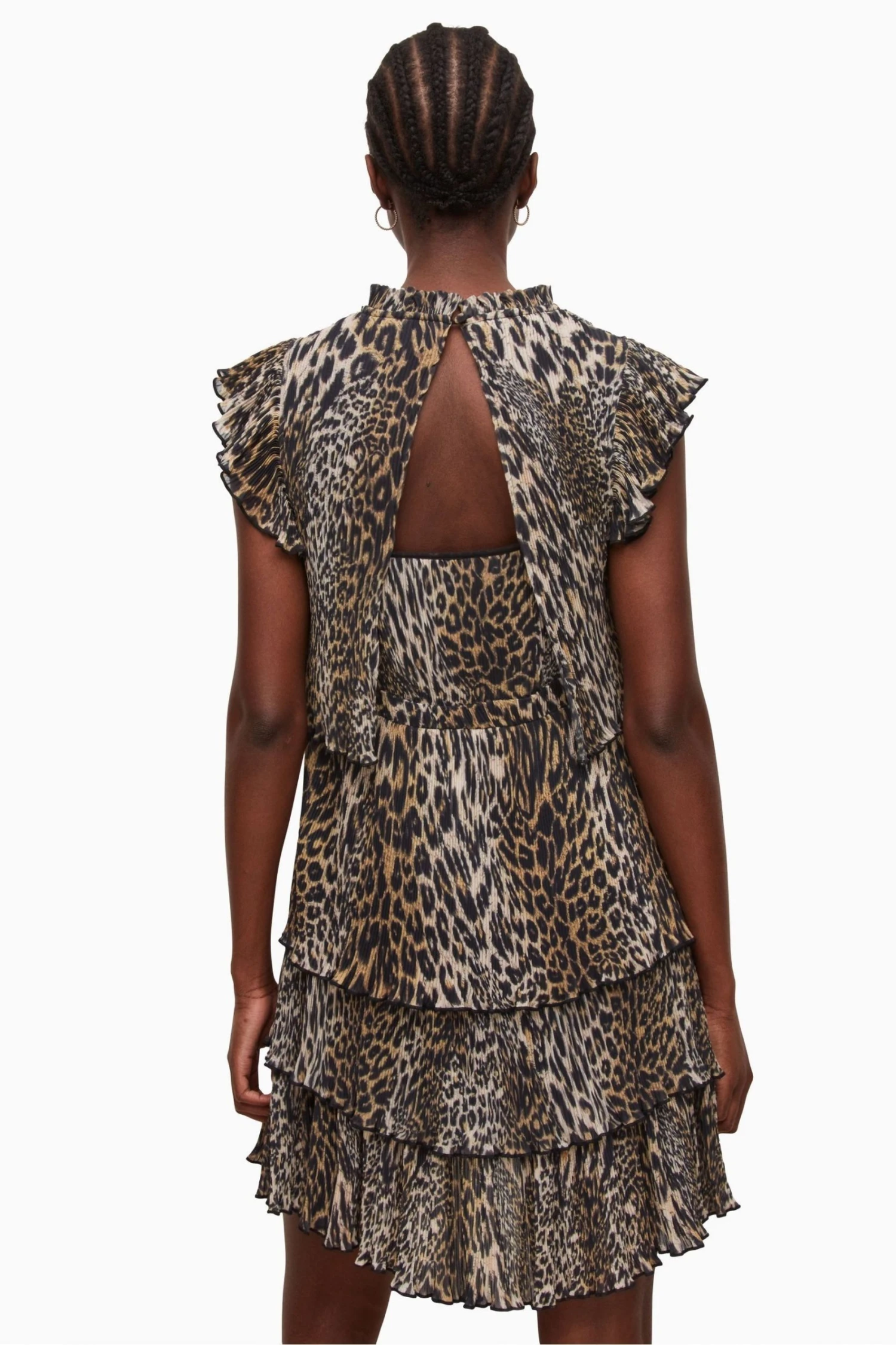 High neck. Button and zip closure. Short sleeves. Four tier construction. Micro-pleated. Gathering on the lower tier. Frill standing collar. Oversized frill shoulders. New season animal print – Kiku: the Japanese word for chrysanthemum – the national flower of Japan, it symbolises nobility, purity and trust. Recycled materials.