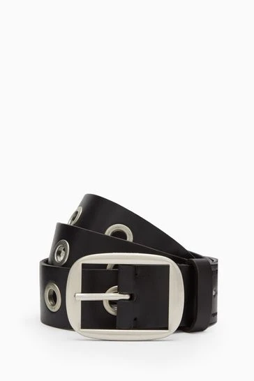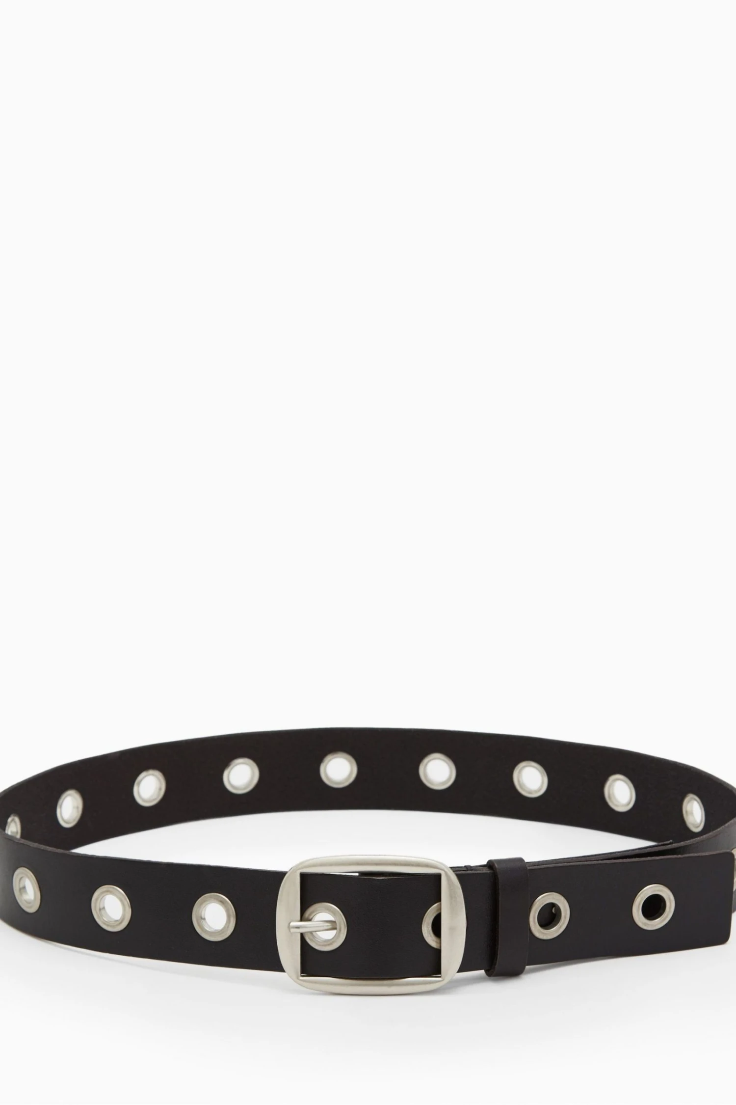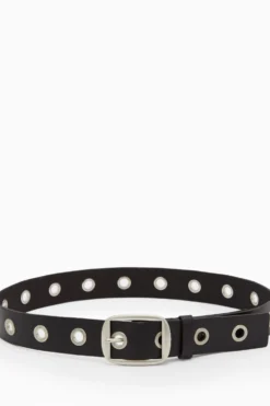 Flat eyelets along entire strap. fully adjustable. Width: 38mm. Smooth leather. eyelet detailing. Antique Nickel. Buckle-Zinc Alloy. Rivets- Brass. Blind emboss logo with stud detail at backtab. Sustainability attribute: LWG Gold Rated Tannery.