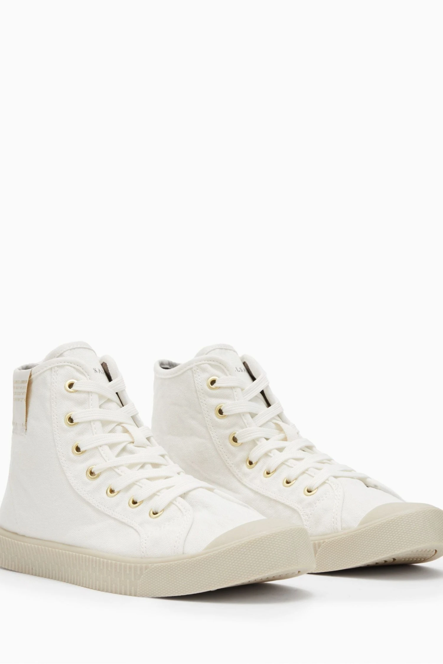 These are high top convas injected sneakers with branded woven label over top line. Lace up and round toe. Woven branded label.