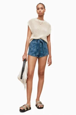 Mid-rise. Button closure. Frayed hems. Cargo pockets. Stretch denim. Vegan leather washer. Reinforced pockets. Skinny fit.