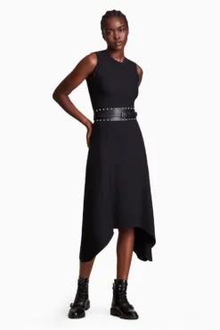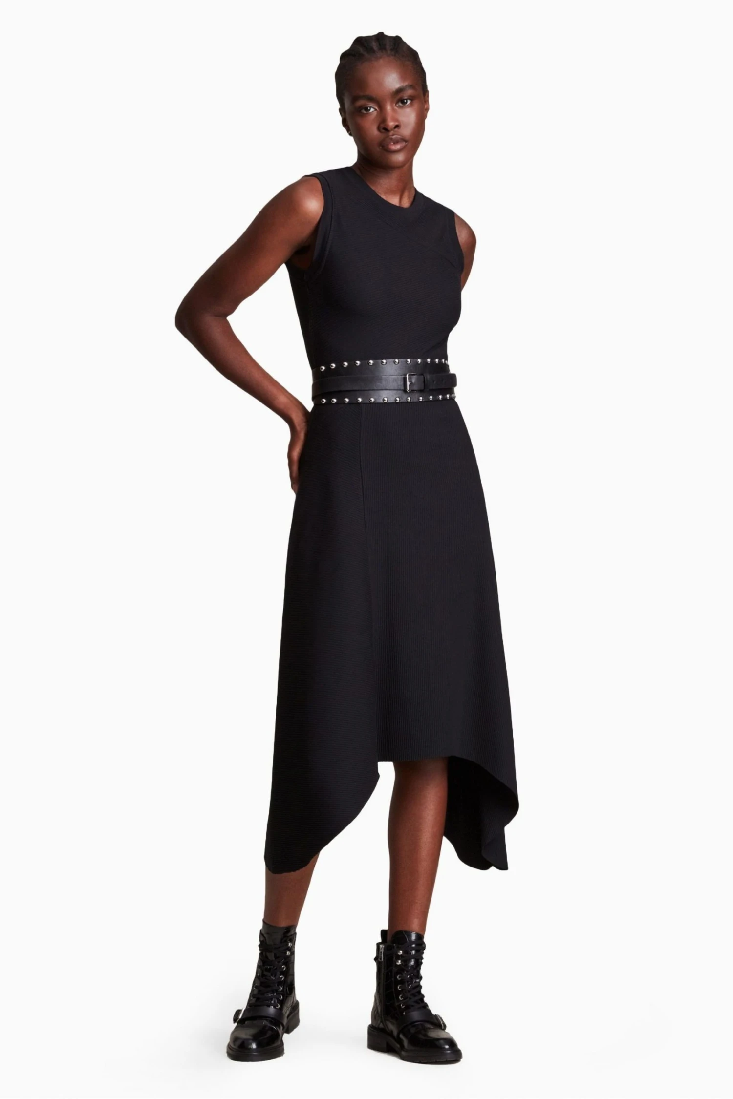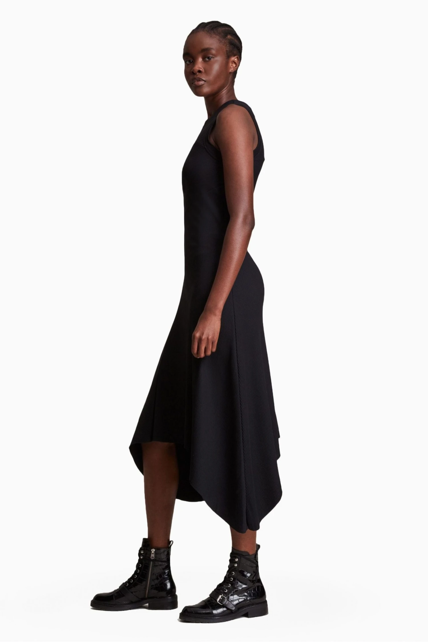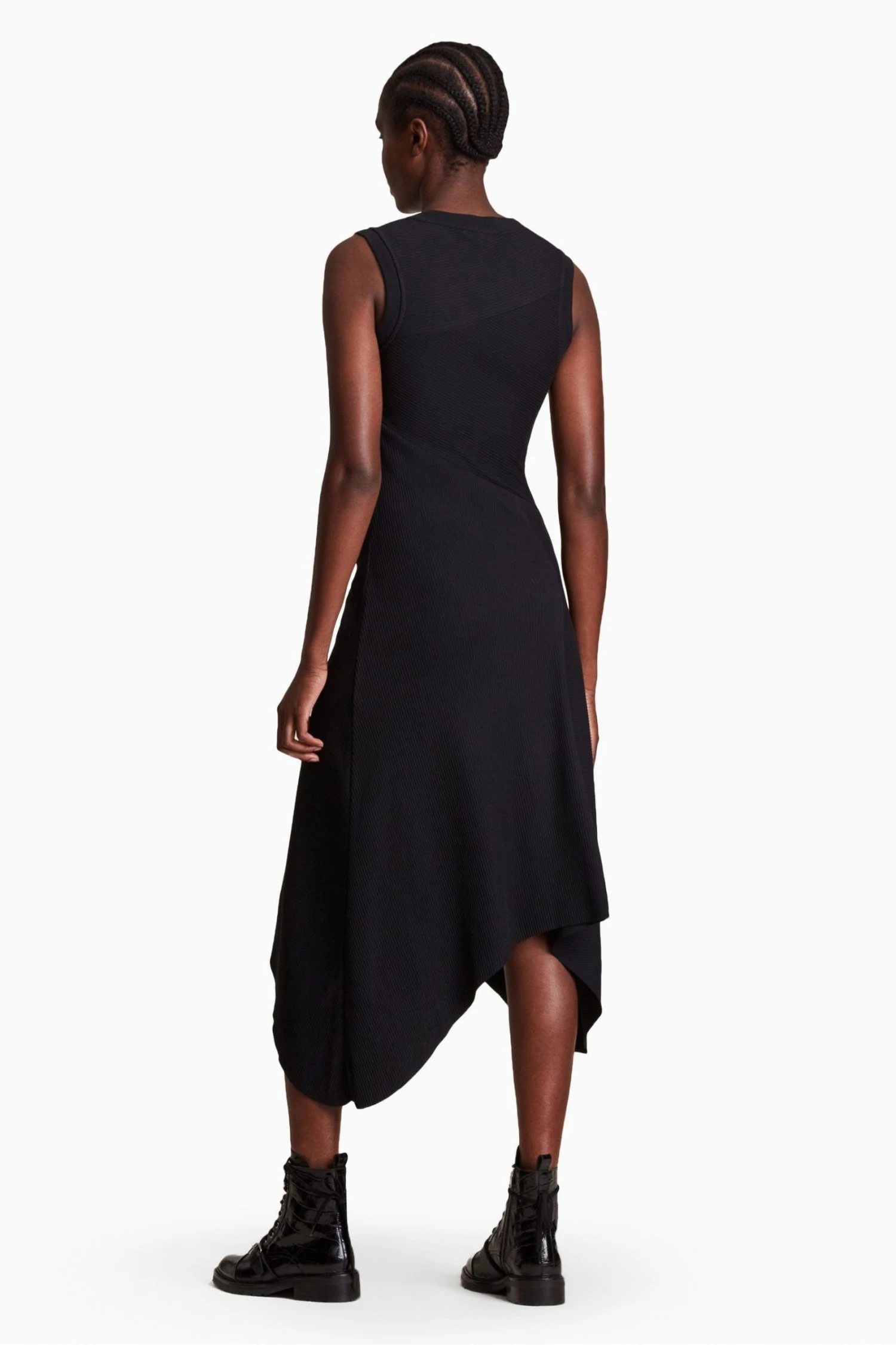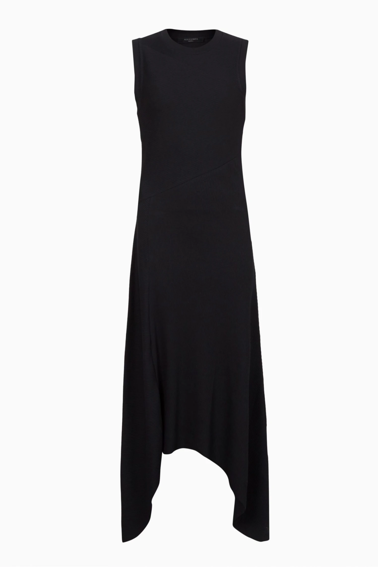 Pullover. Crew neck. Sleeveless. Ribbed texture. Midi length. Raw hem. ALLSAINTS cotton products support more sustainable cotton farming. Better Cotton is sourced via a system of Mass Balance