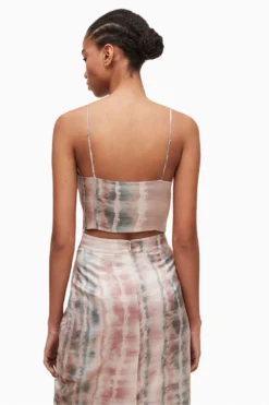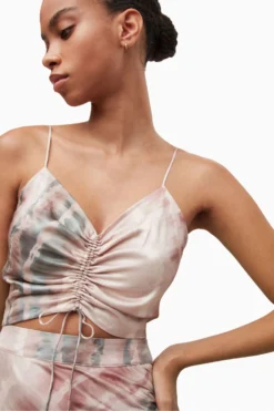 It is a pull over and a relaxed fit. Designed with short length, V-neck, sleeveless and a cami top. Featuring, drawcord channel and self fabric straps down centre front allows you to adjust the length. Lined.