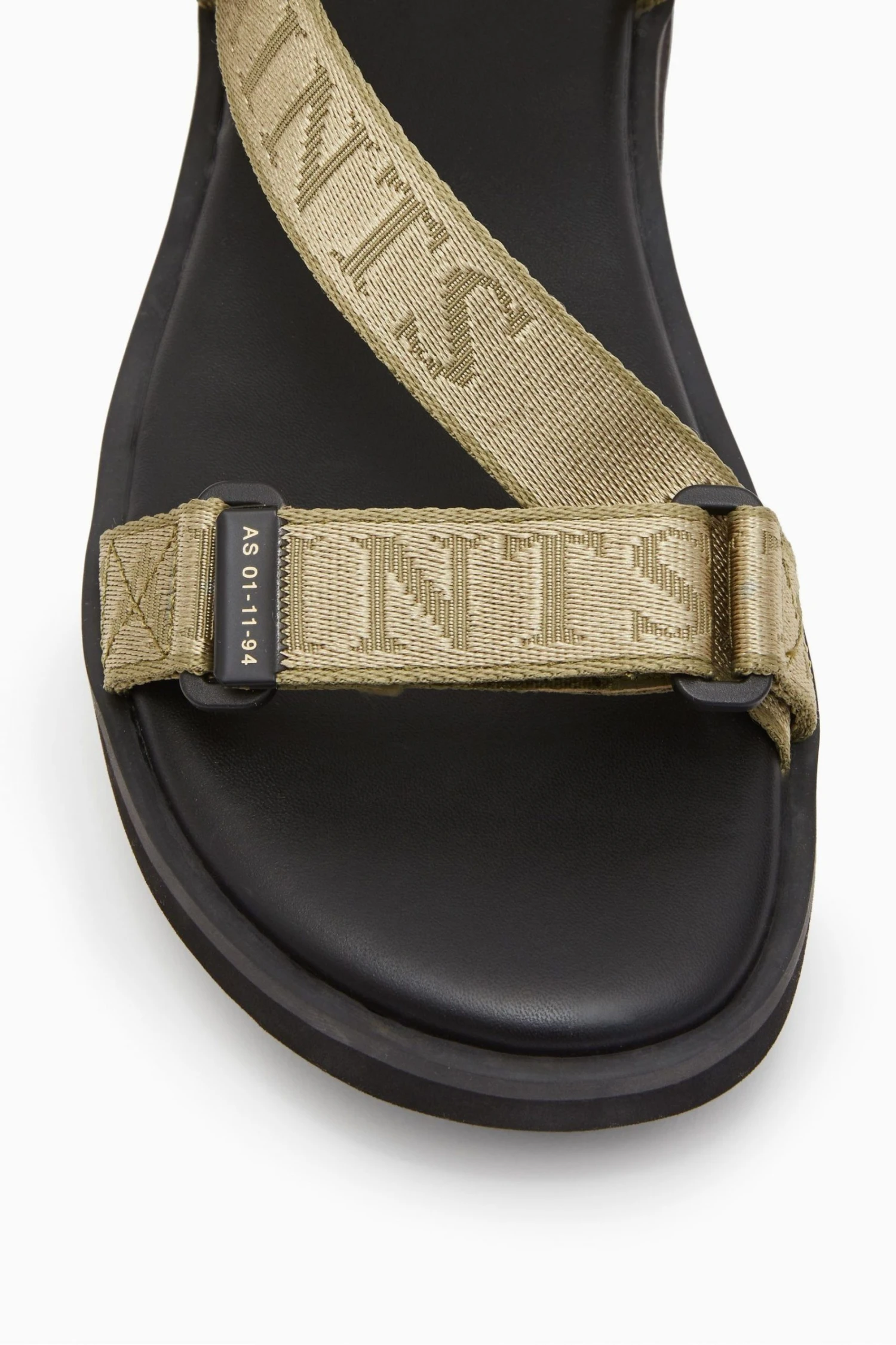 Tonal branded webbing tape with metal branded strap ends. On cleated military style sole.