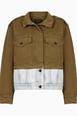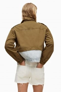 Button closure. Relaxed fit. Short length. Collar. Long sleeve. Illusion of having two jackets layered on each other. The top half being in a military green colour and the bottom in a classic denim indigo. Concealed button closure on the top green half and a normal button closure on the button denim half. The jacket has two pockets with flaps and a button closure on the front, has the classic military strap detail on the shoulders and has the military green fabrication on the sleeves.