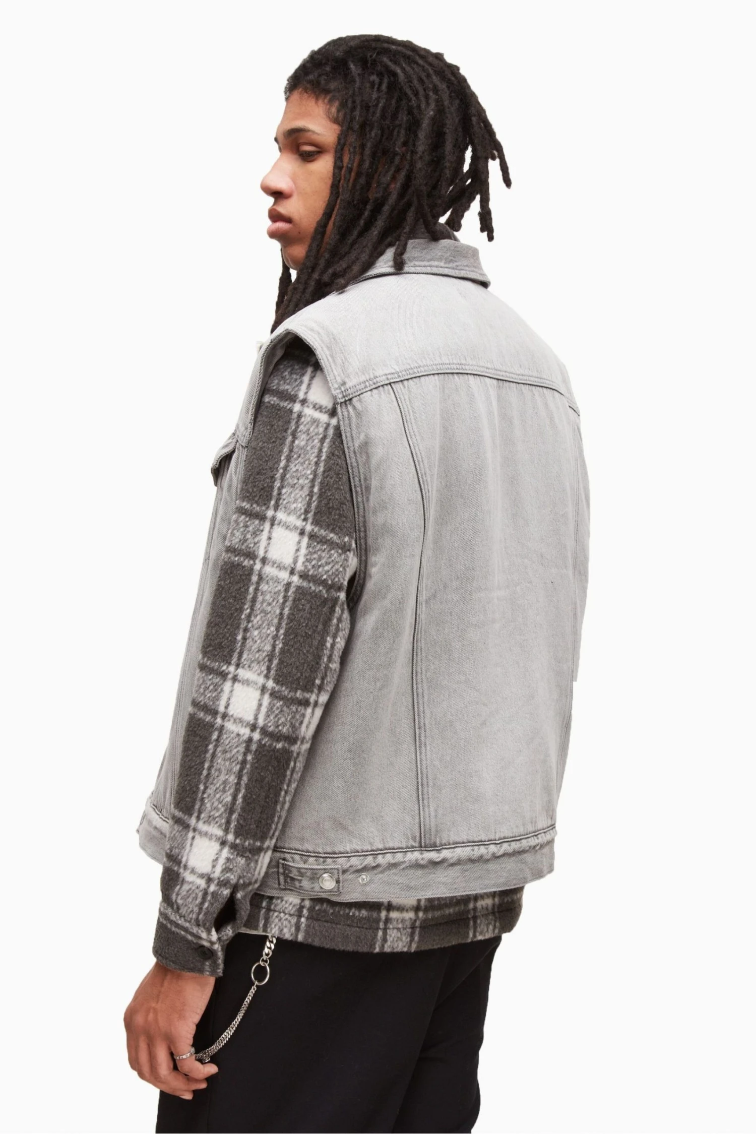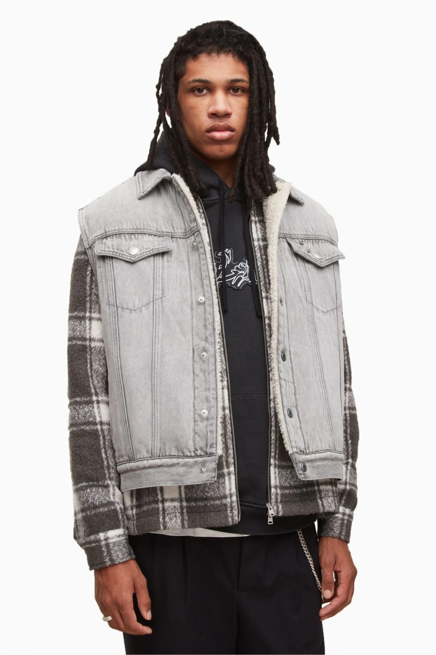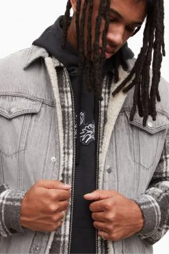 Grunge aesthetics, the AllSaints way. The Kaimuki Jacket has a classic trucker construction, but sleeveless. Heavy washed grey denim with a borg lining. Layer it up. Sleeveless. Push stud closure. Trucker style. Front yoke and pannelled details. Two chest pockets. Borg lining. Side welt pockets. Heavy washed denim. Worn with Honshu Shirt Jacket, Patched Hoodie and Trueno Belt Chain. Model is 6’1.5″/187cm and is wearing size Medium. ALLSAINTS cotton products support more sustainable cotton farming. Better Cotton is sourced via a system of Mass Balance.