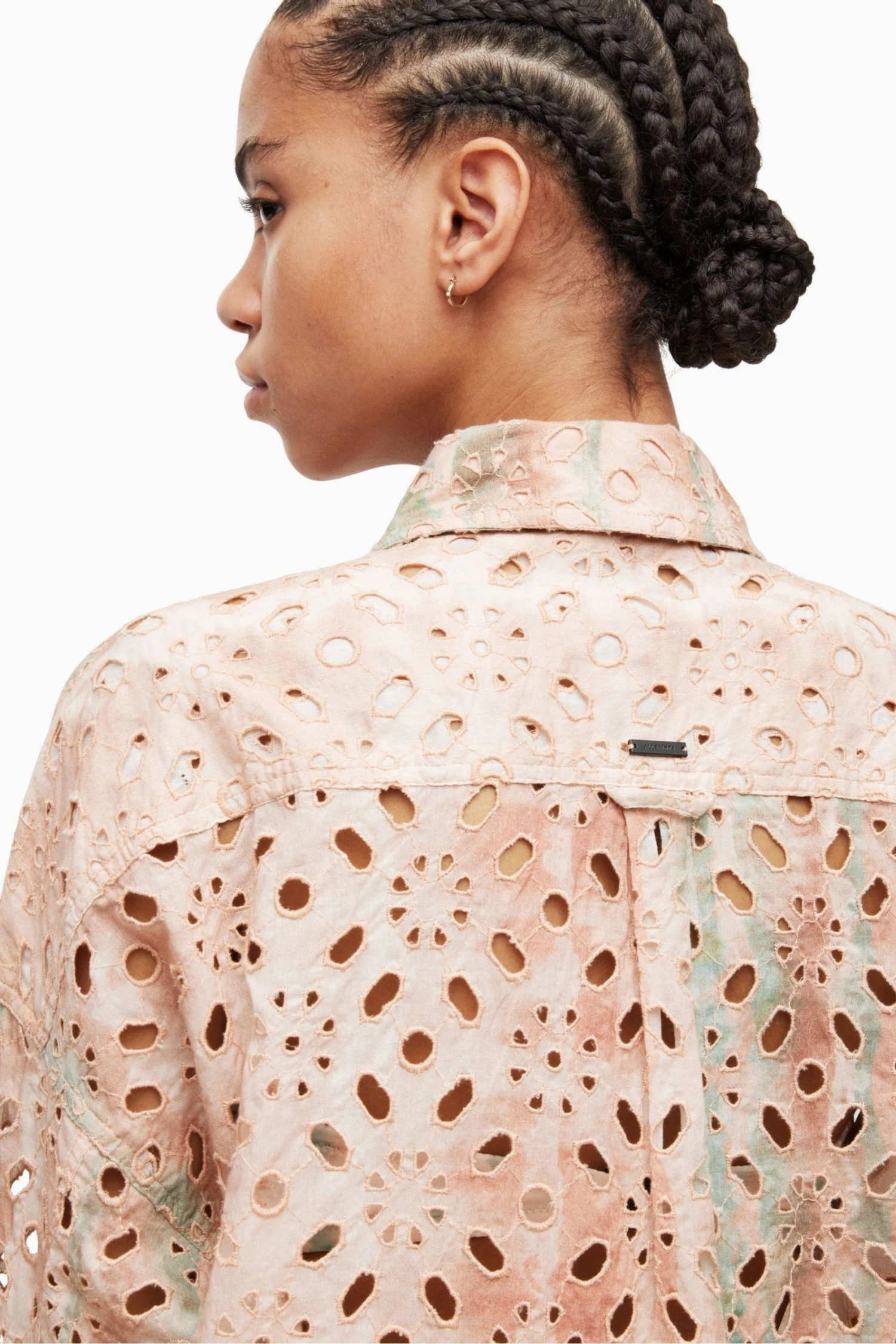 Button closure. Collar. Long sleeve. Oversized short shirt dress. Made in a cotton broderie with open cut out artwork and printed on top. Buttons run along the front. No Pockets.
