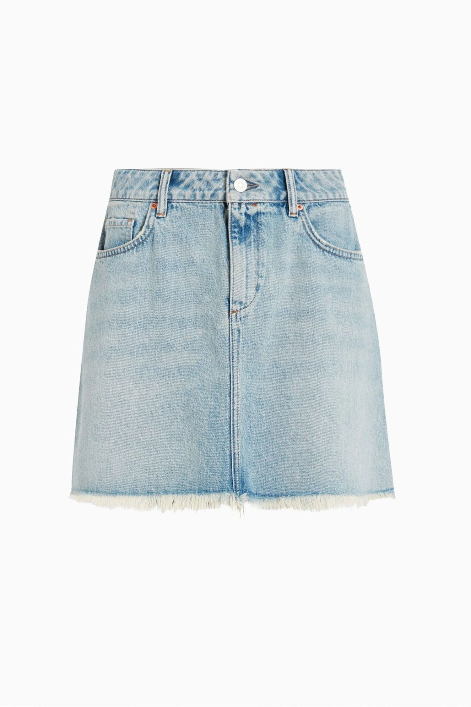 Featuring zip and button closure, relaxed fit, mini length, classic A-line mini skirt shape, frayed/raw hem and straight hem.
