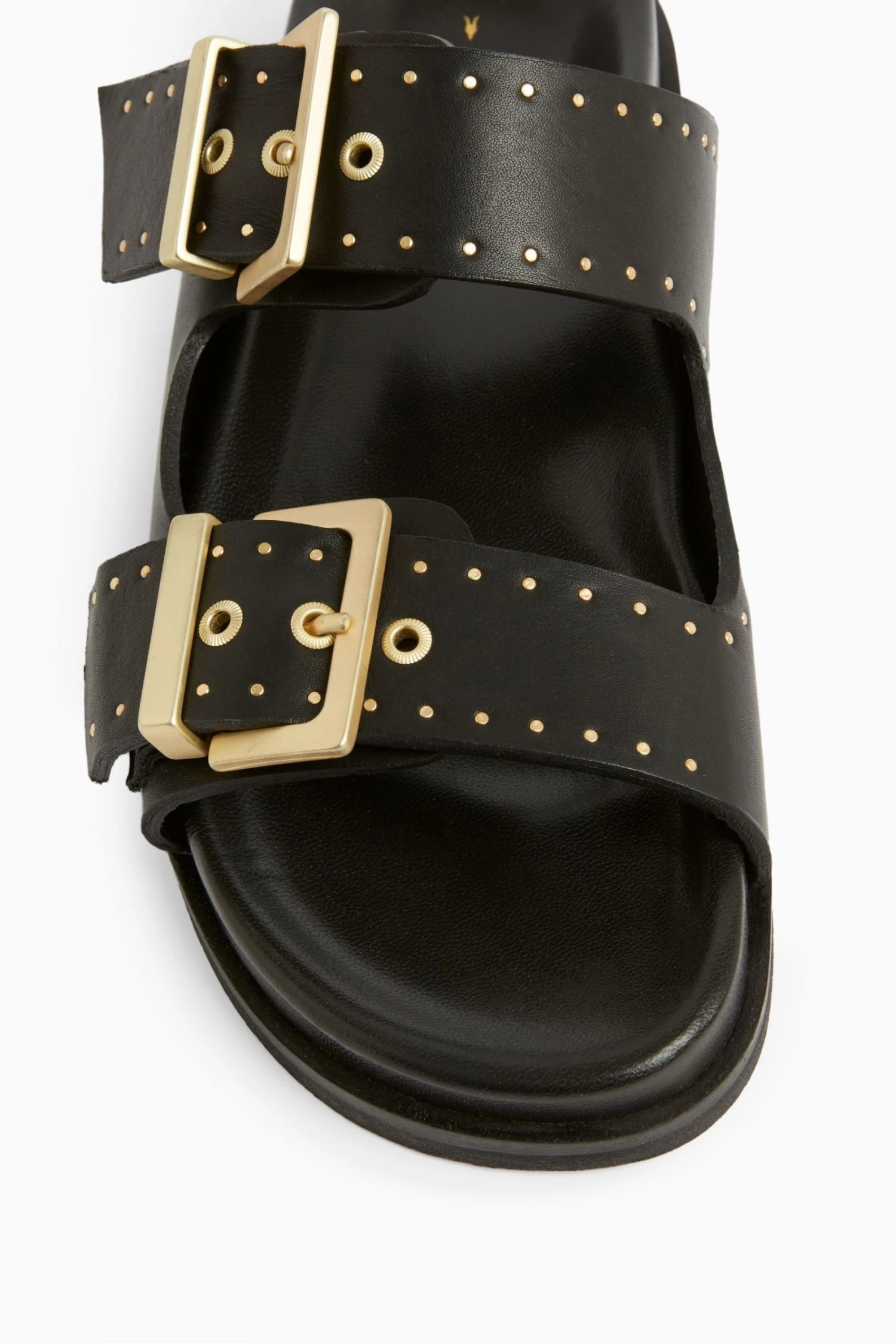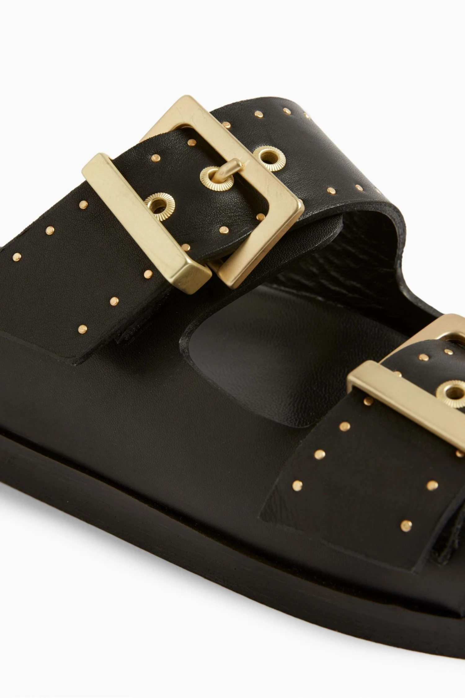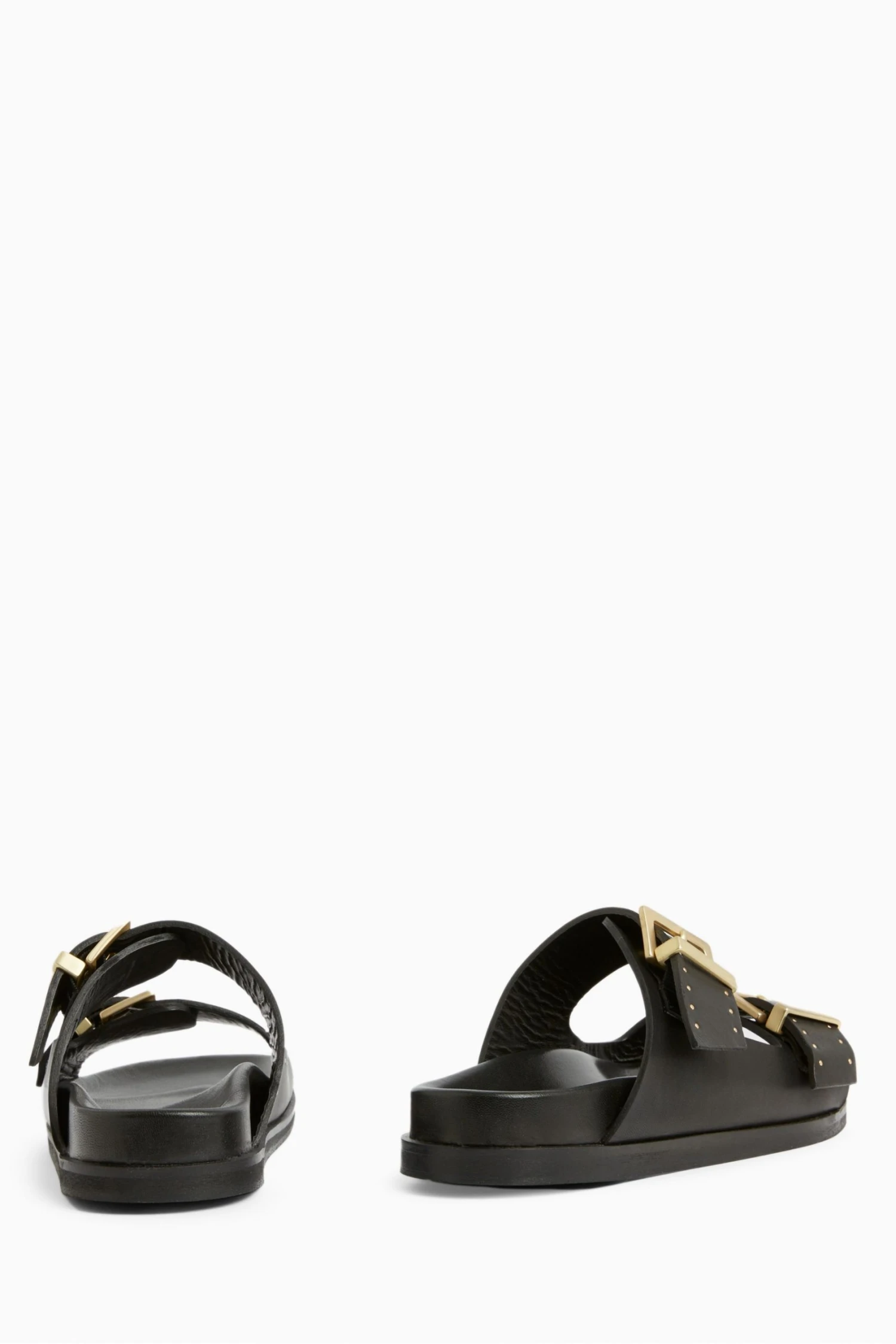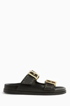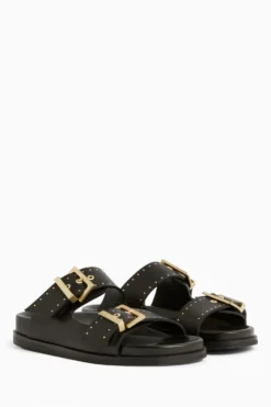 The sandals are round toe branded square buckle and stud work on leather wrapped footbed and branded square buckle.