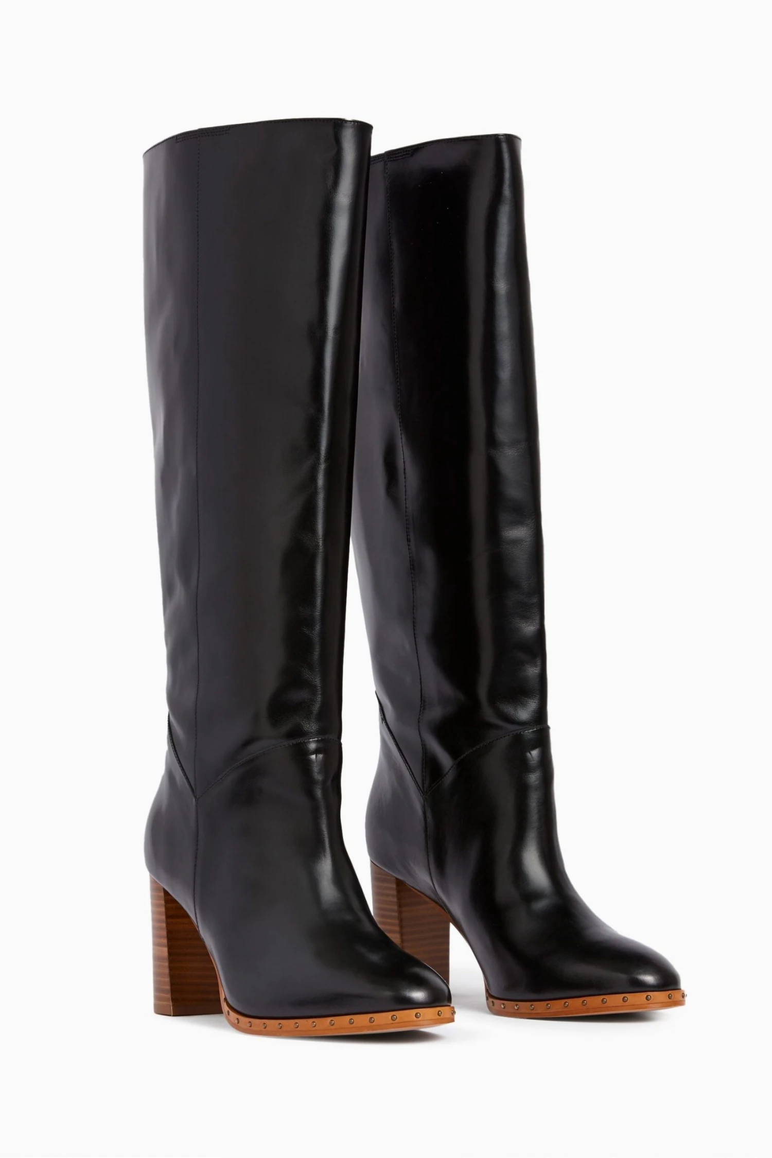Knee high boots. Featuring block leather wrapped heel. Elastic gusset feature and platforms.