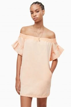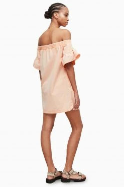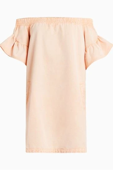 Off-shoulder. Short sleeve. The Adela Dress is a off the shoulder denim mini dress. It has a short sleeve with a subtle ruffle and is a straight fit down the body. Two pockets.