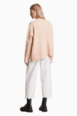 Pull over. V-neck. Long sleeve. Knitted from a soft, fluffy, blend of RWS wool, yak and recycled nylon. This v-neck oversized jumper is made up of panelled cable stitches and features classic AllSaints asymmetric hem shape with deep side spltis and deep rib trims.. No Pockets. Sustainability Attribute: RWS wool and recycled nylon.