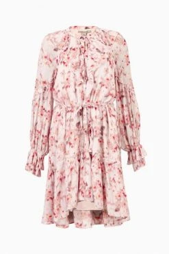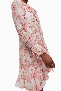 V-neckline. Button closure. Long sleeves. Drawcord waist. Frill detail at the collar and cuffs. Tiered frill hem skirt. Crinkle sheer fabrication. New season floral print – Momo: it means peach blossom in Japanese. Recycled lining. Sustainable EcoVero™ viscose.