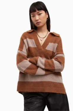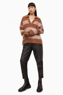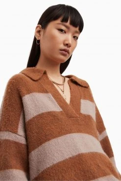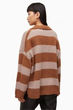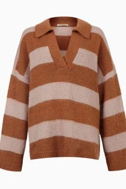 Striped. Pullover. Polo collar. V neck. Ribbed trims. Long sleeve. High side splits. Brushed for a soft handfeel. RWS certified wool (CU 870616). The Responsible Wool Standard (RWS) is an industry tool that ensures the wool comes from farms where the land has been managed and the sheep have been treated responsibly. Relaxed fit.