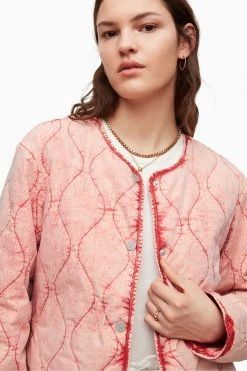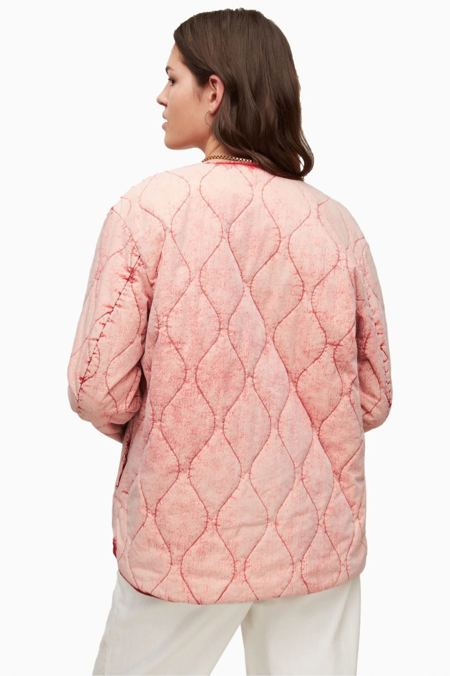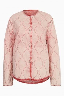 It is a regular fit. Designed with button closure, short length, round neck, long sleeves, dropped shoulder, oversized cocoon shaping.and curved hemline. Featuring pockets in side seam and branded snaps at centre front fastening and two pockets. It is lined and washed pink onion quilted liner jacket.