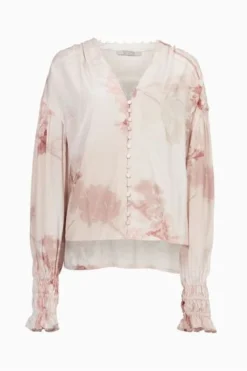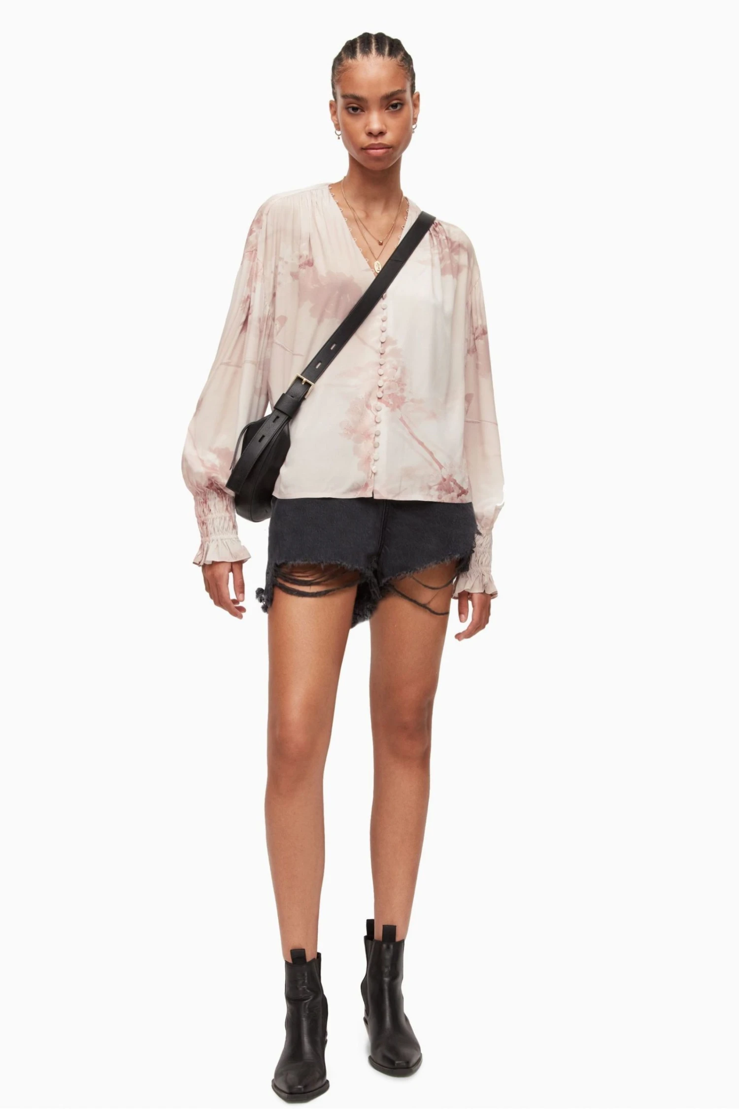 It is a relaxed fit. Designed with V-neck, long sleeve, button closure, loop detailing. Featuring, self fabric buttons, elasticated cuffs and frill detail cuff. New season Ume print: it is Japanese apricot blossom, symbolising elegance, faithfulness and a pure heart. Sustainable EcoVeroâ„¢ viscose.