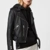 Featuring zip closure, slim fit, collar, long sleeves, metal hardware trims. The garment has full length slim sleeves with added shaping at the elbow and concealed zip at the hind arm seam cuff with unlined gusset detail. Two lower zip pockets with self leather pullers and stud detail and set in epaulette at the shoulder with box stitch topstitch detail.