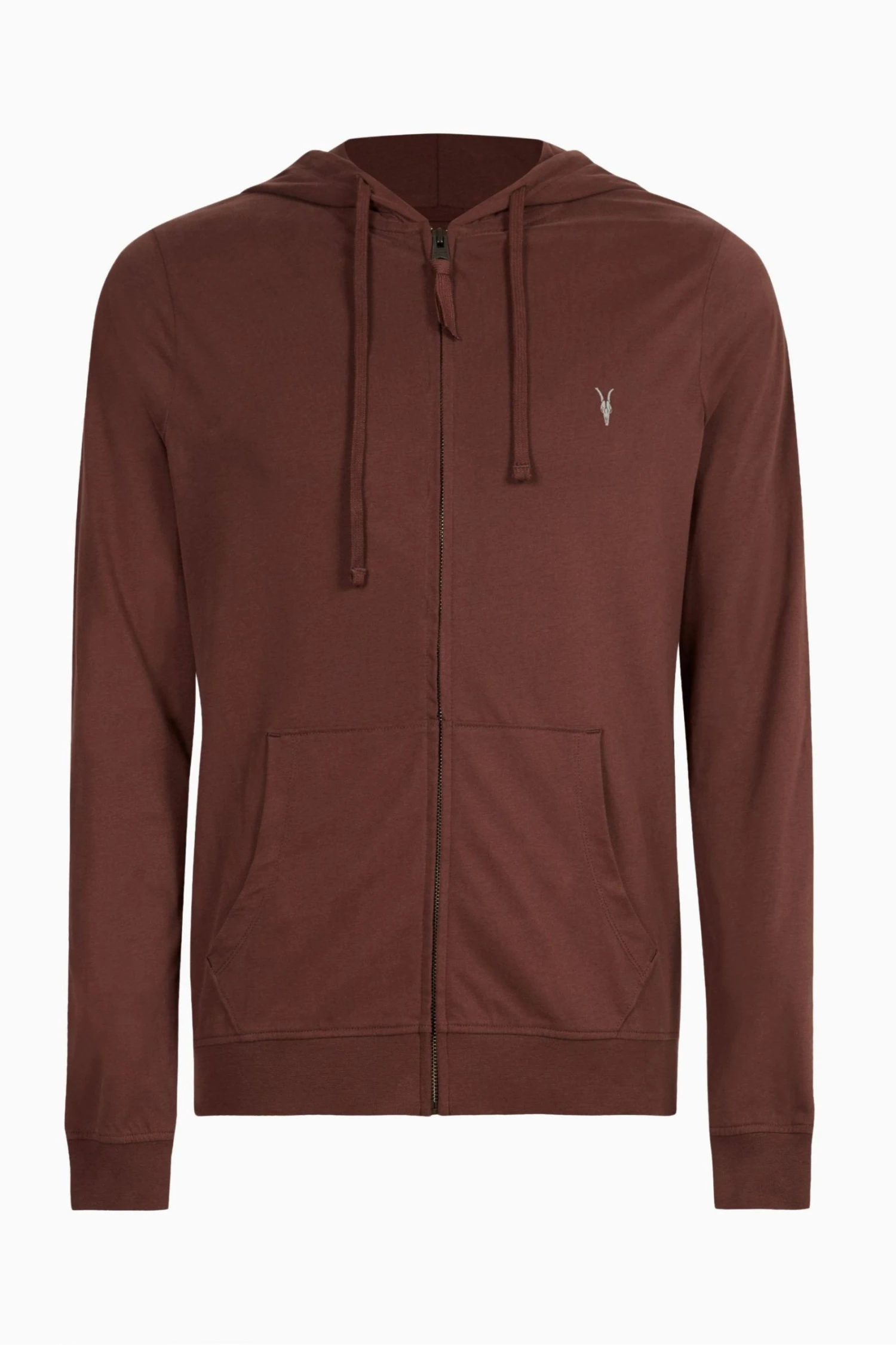 Designed to be hooded with long sleeve, patch pockets, zip front and ramskull embroidery.