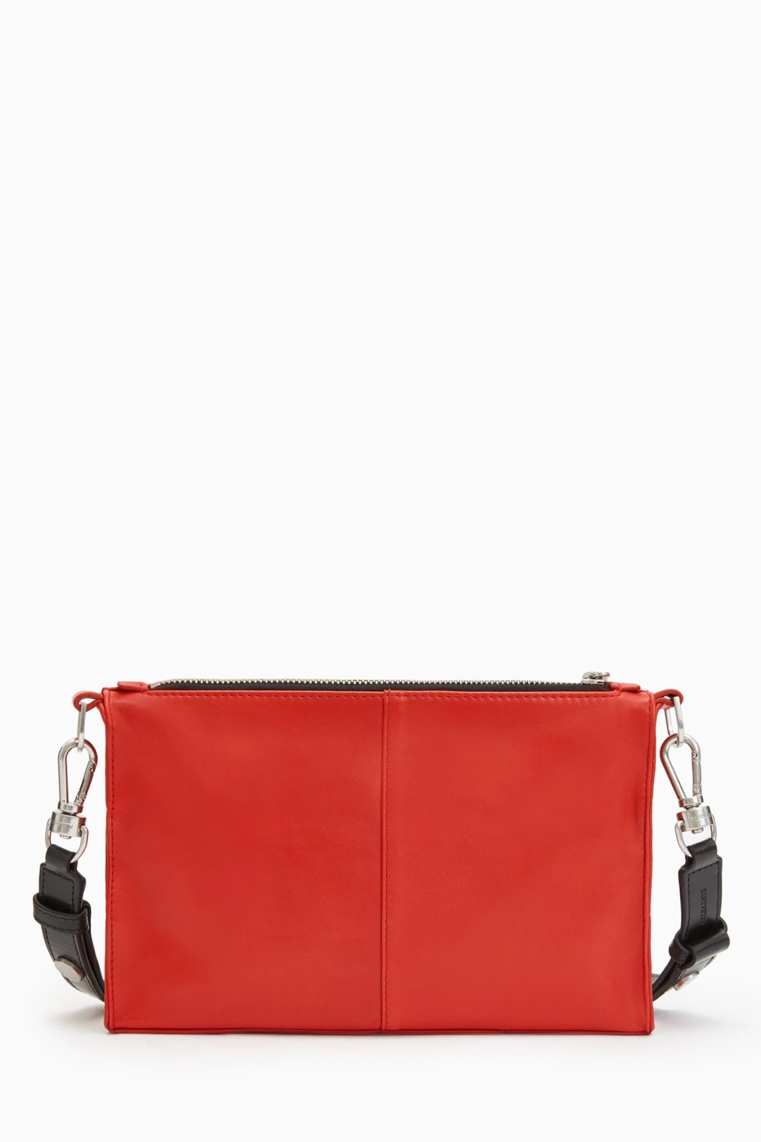 Zip closure. Leather crossbody strap. Chain crossbody strap. Removable leather strap. One internal zip pocket. One internal slip pocket. Gold-tone hardware.