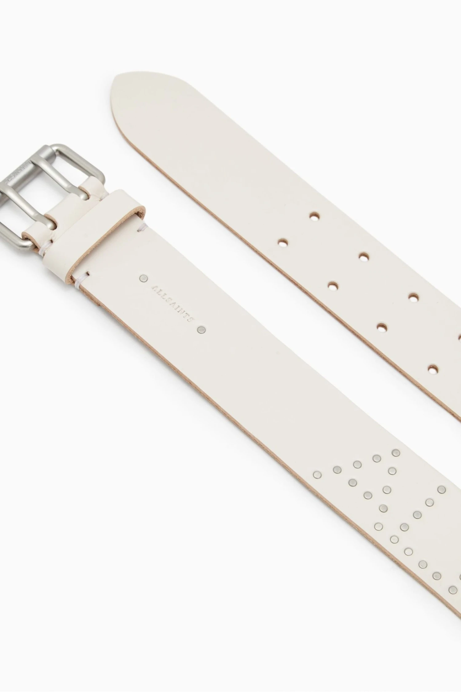 Featuring buckle and smooth hip belt with AllSaints stud detailing. XS: 88.9CM, S:96.52, M: 104.14, L: 111.76, XL: 119.38. Width: 38MM. Flat stud detailing spelling out AllSaints. Warm Brass. Classic logo engraved at top side of buckle, blind emboss logo with stud detail at back tab. Sustainability attribute: LWG GOLD RATED TANNERY.