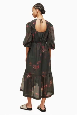 Featuring a V-neck, 3/4th sleeves, long length printed dress, drawcord channel for flexibility, open back detail, tie detail at the back neck, elasticated cuff. tiered volume skirt, shorter shaped front hem, side splits and no pockets.