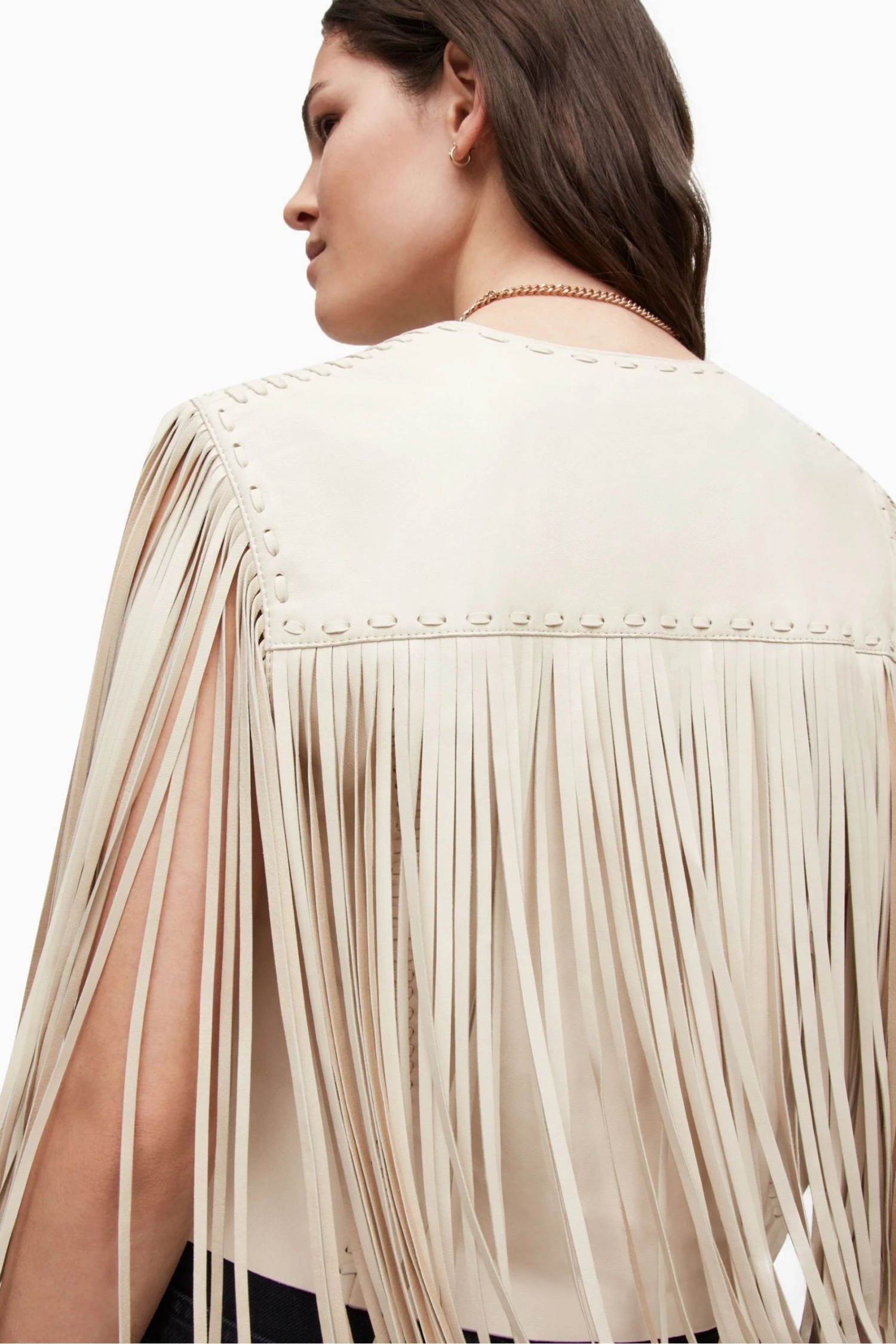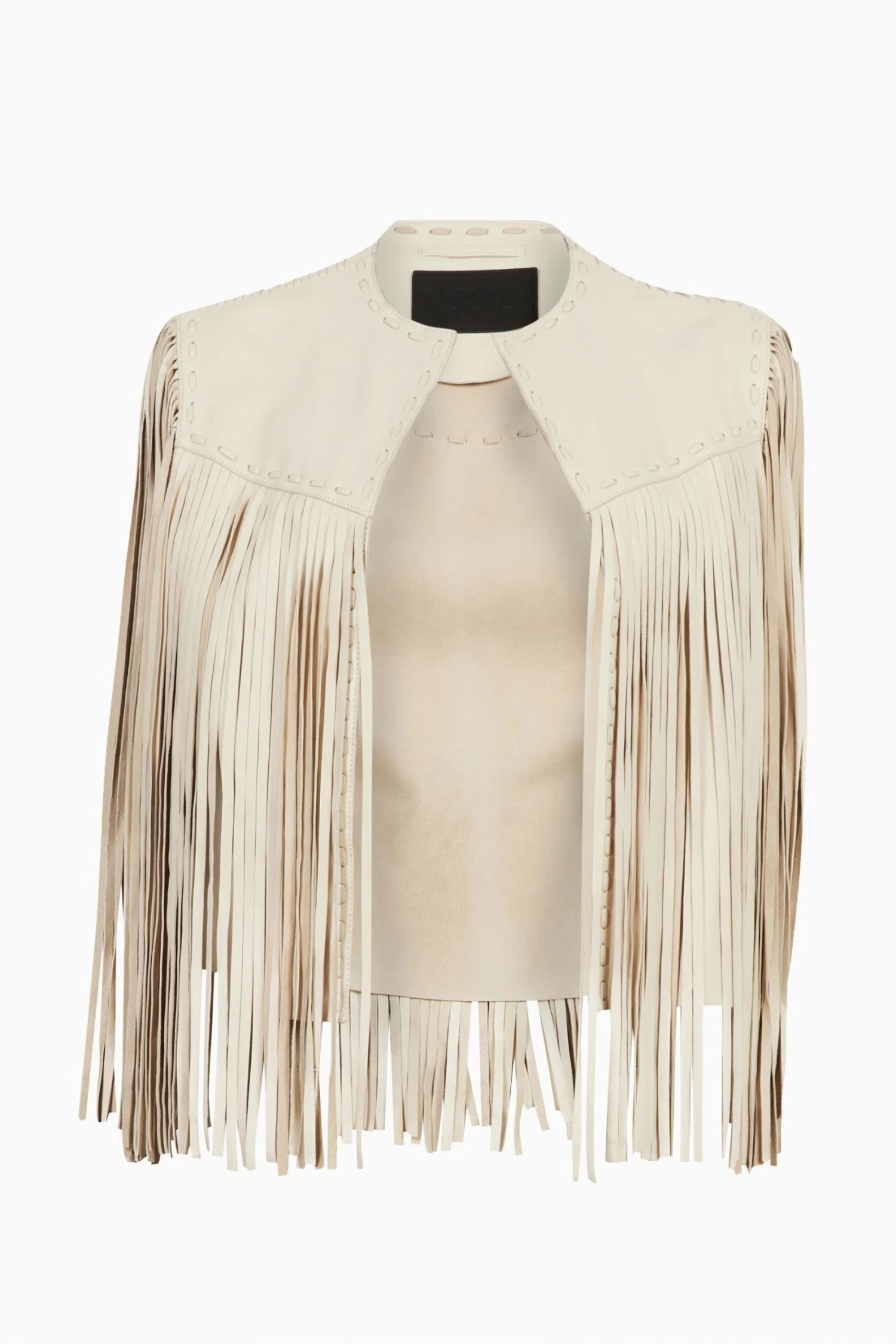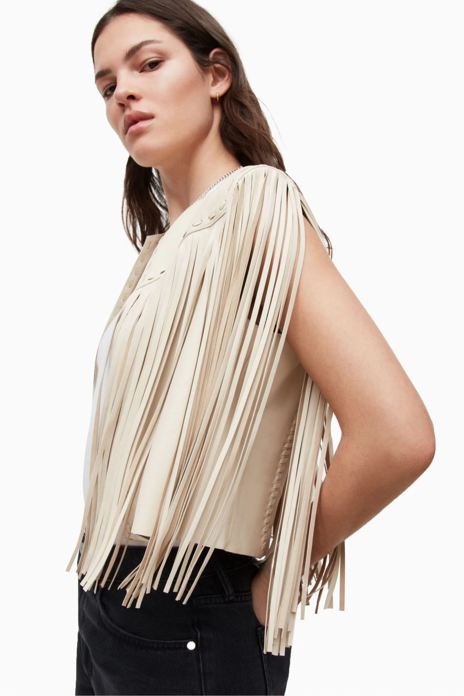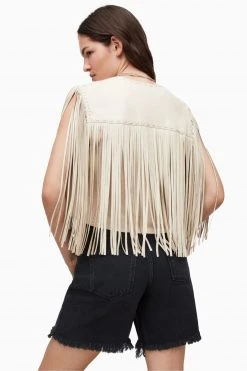 This gilet features open front, sleeveless, tassel front and back, fully unlined with whip stitch detailing and relaxed fit.