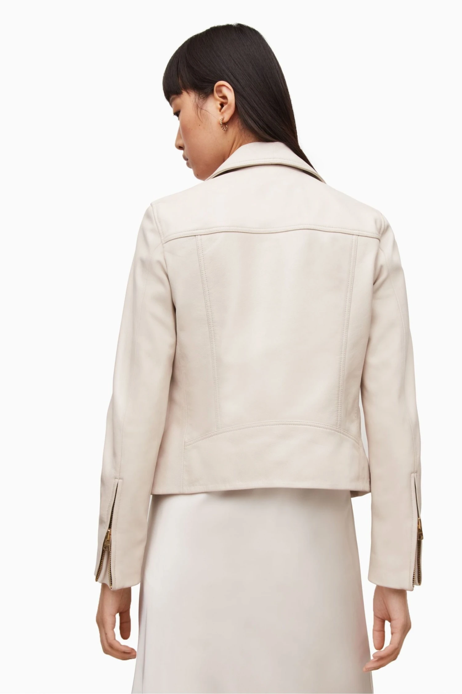 No fuss leathers. The Dalby Biker Jacket is a minimalist design, crafted in a dark raspberry pink hue. Shiny gunmetal trims contrast the smooth leather base. Long sleeve. Fully lined. Leather zip pulls. Two lower pockets. Shiny gunmetal popper fastenings. Model is 5’10” / 177cm and is wearing size UK 10.