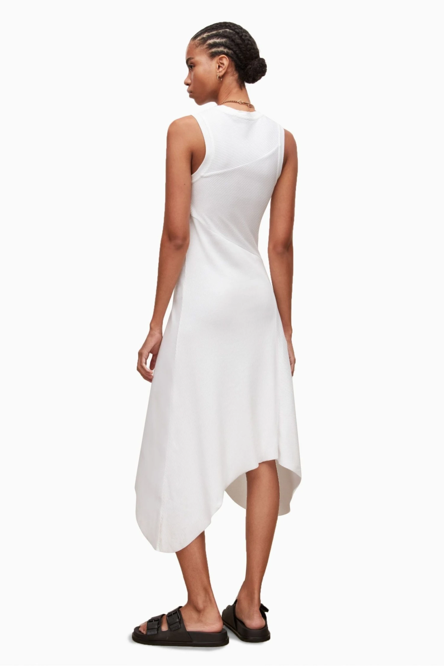 Pullover. Crew neck. Sleeveless. Ribbed texture. Midi length. Raw hem. ALLSAINTS cotton products support more sustainable cotton farming. Better Cotton is sourced via a system of Mass Balance. Slim fit