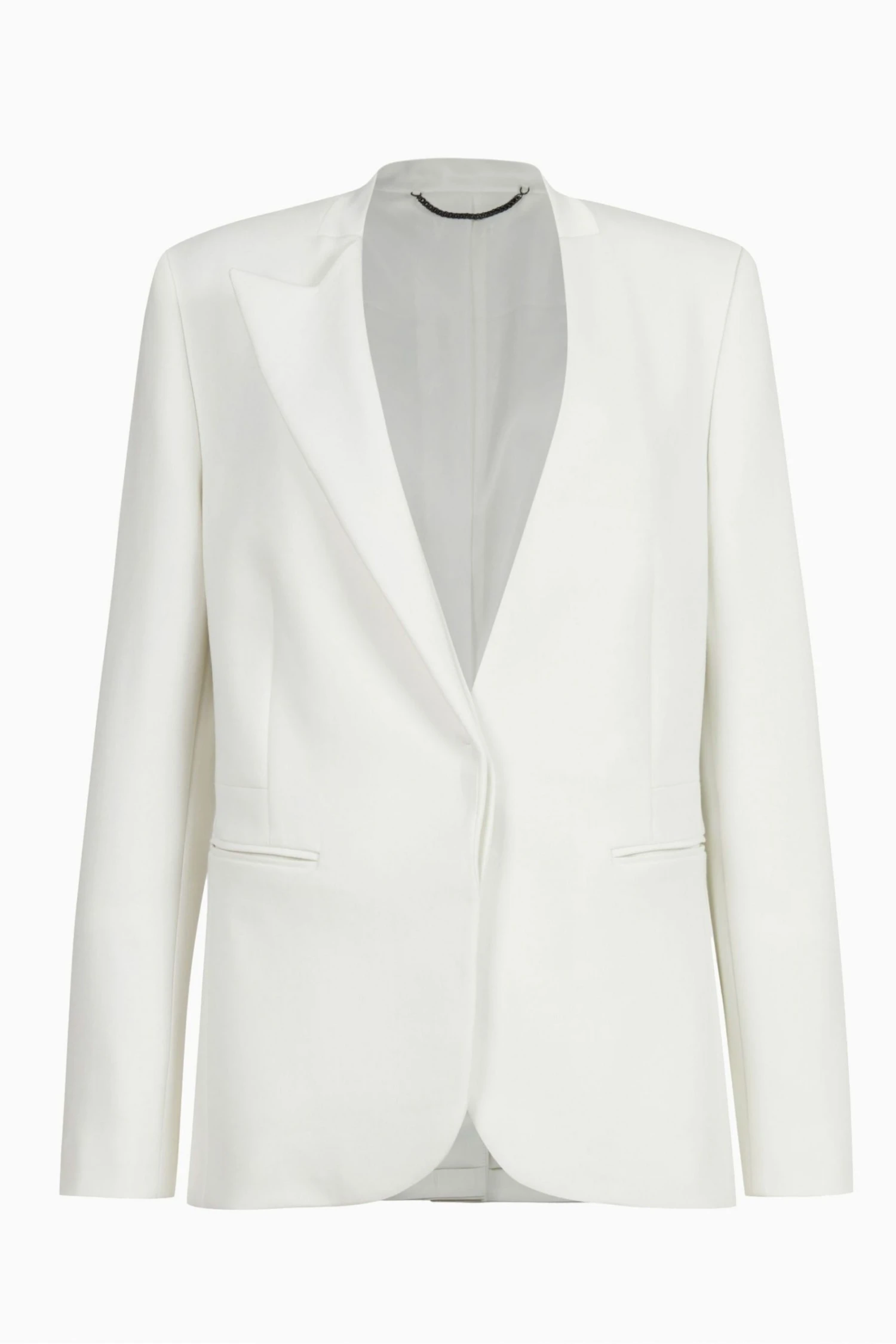 Single button closure. Slim fit. Short length. Collar. Long sleeve. EcoVero and reprieve poly tailored single lapel blazer. Clean construction with satin collar, jet pockets and waist seam. Two pockets. One internal pocket. Lined. RAMSKULL jacquard recycled lining.