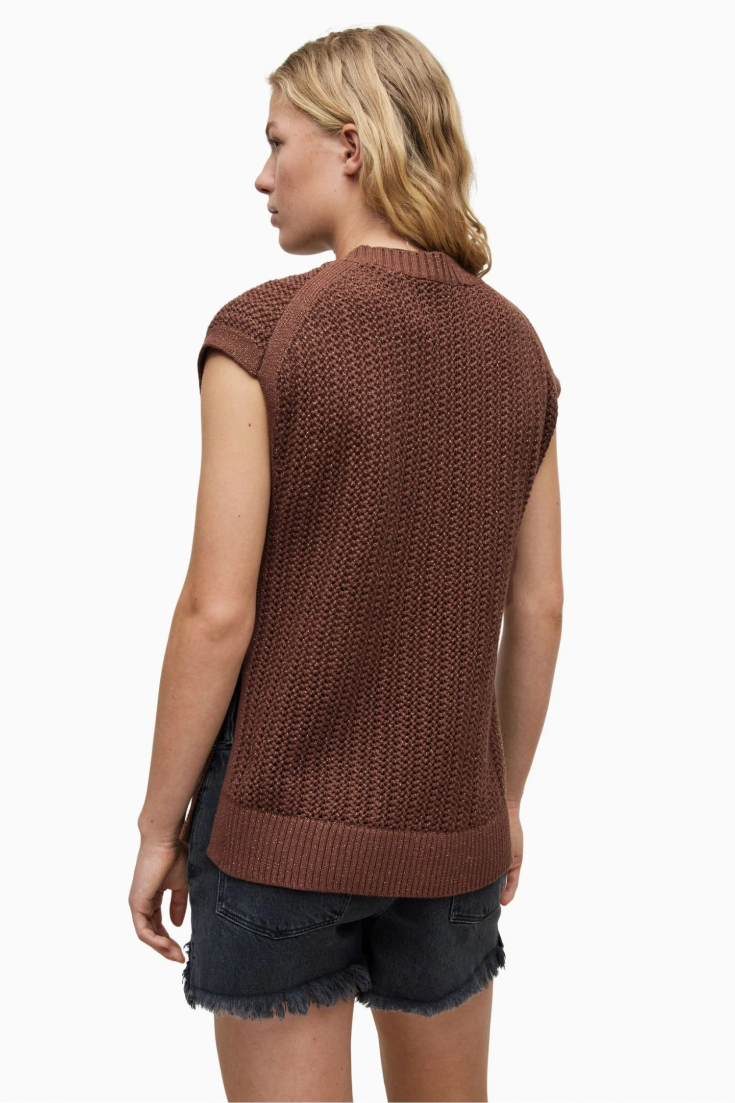 The crew neck sleeveless pullover – mesh stitch tank with high crew neck and deep rib trims, side splits and all needle stitch strappings at side seams and no pockets.