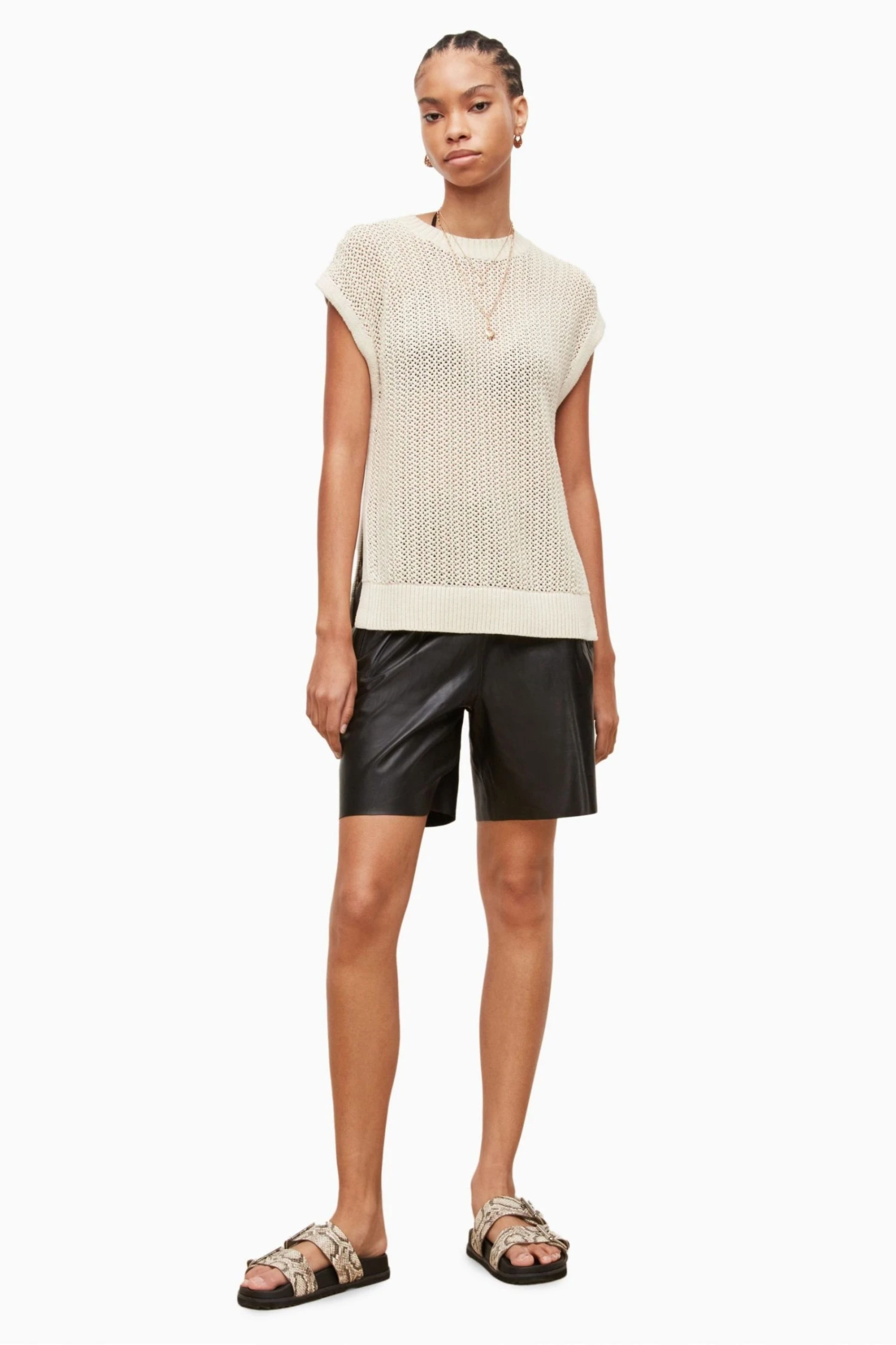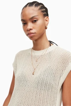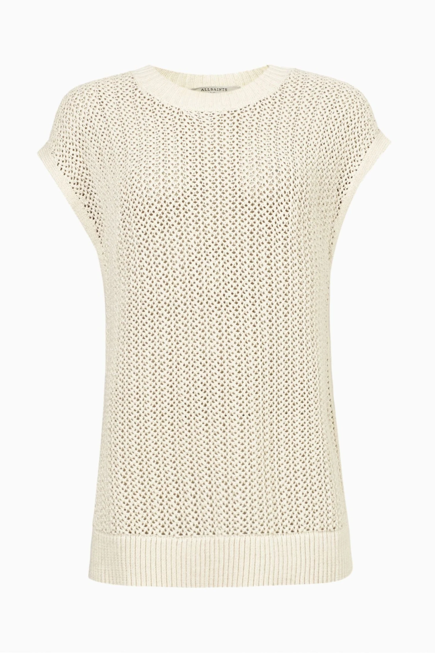 Featuring a pull-over design, crew neck, sleeveless, mesh stitch tank with high crew neck and deep rib trims, side splits and all needle stitch strappings at side seams and no pockets.