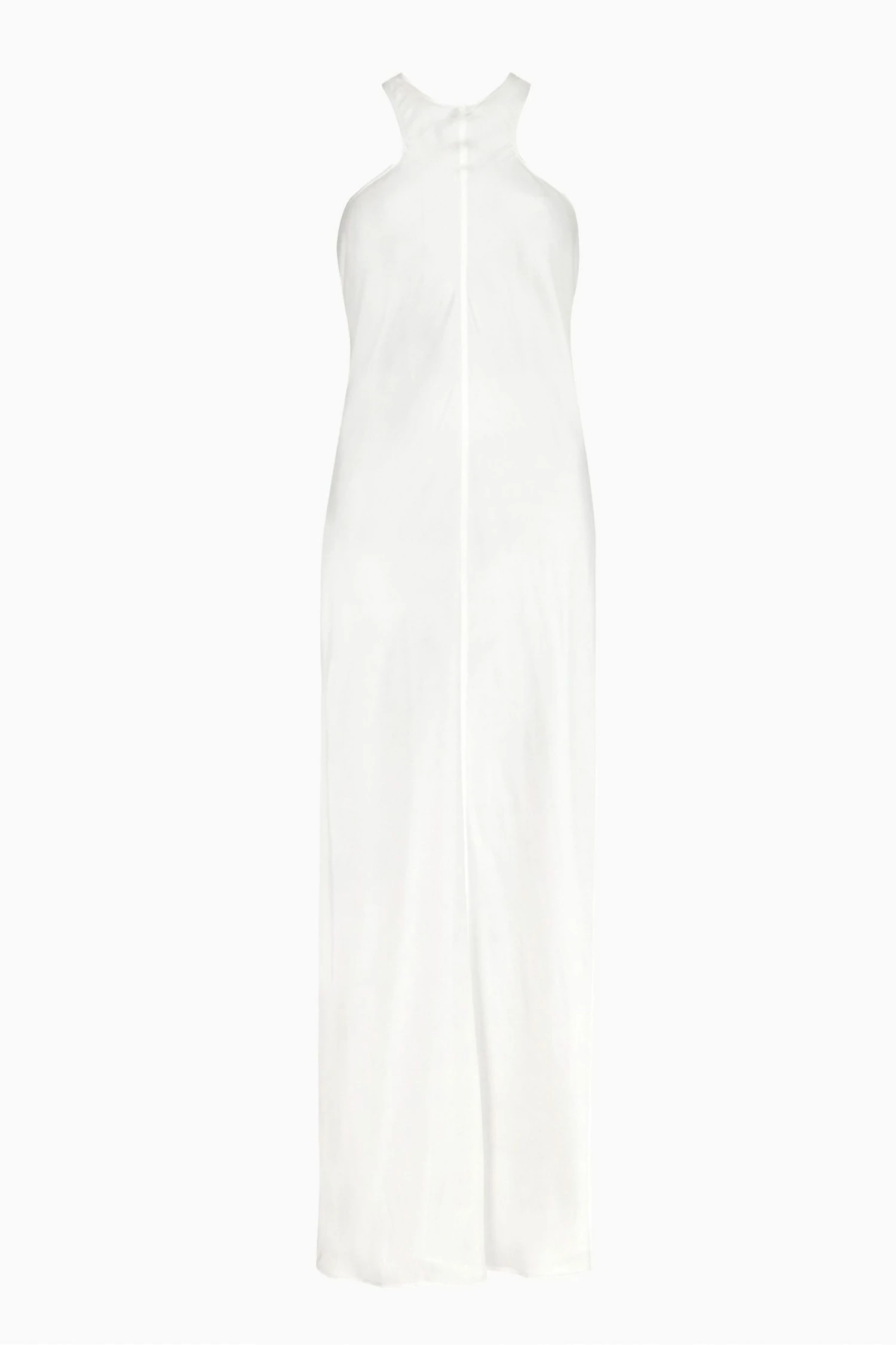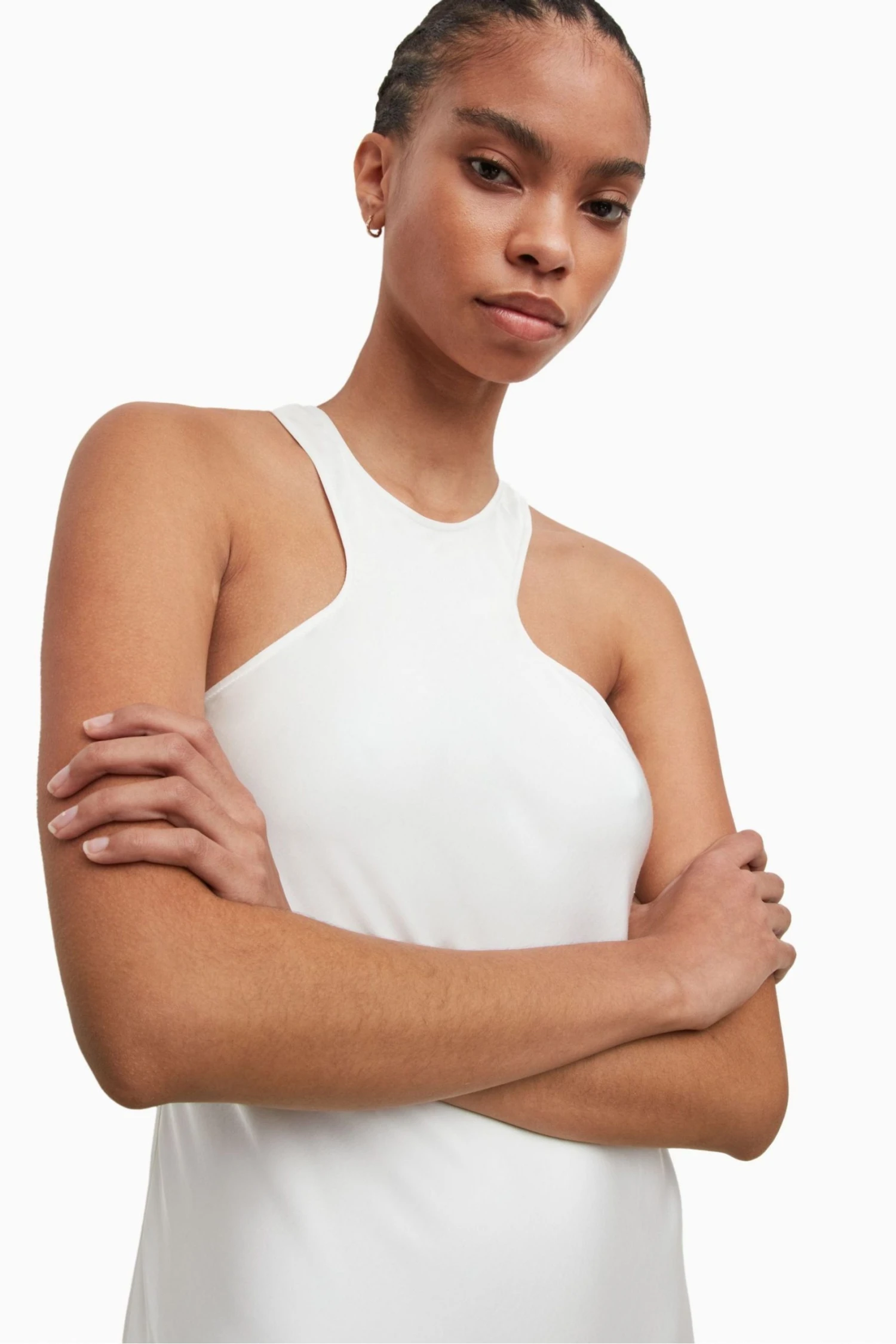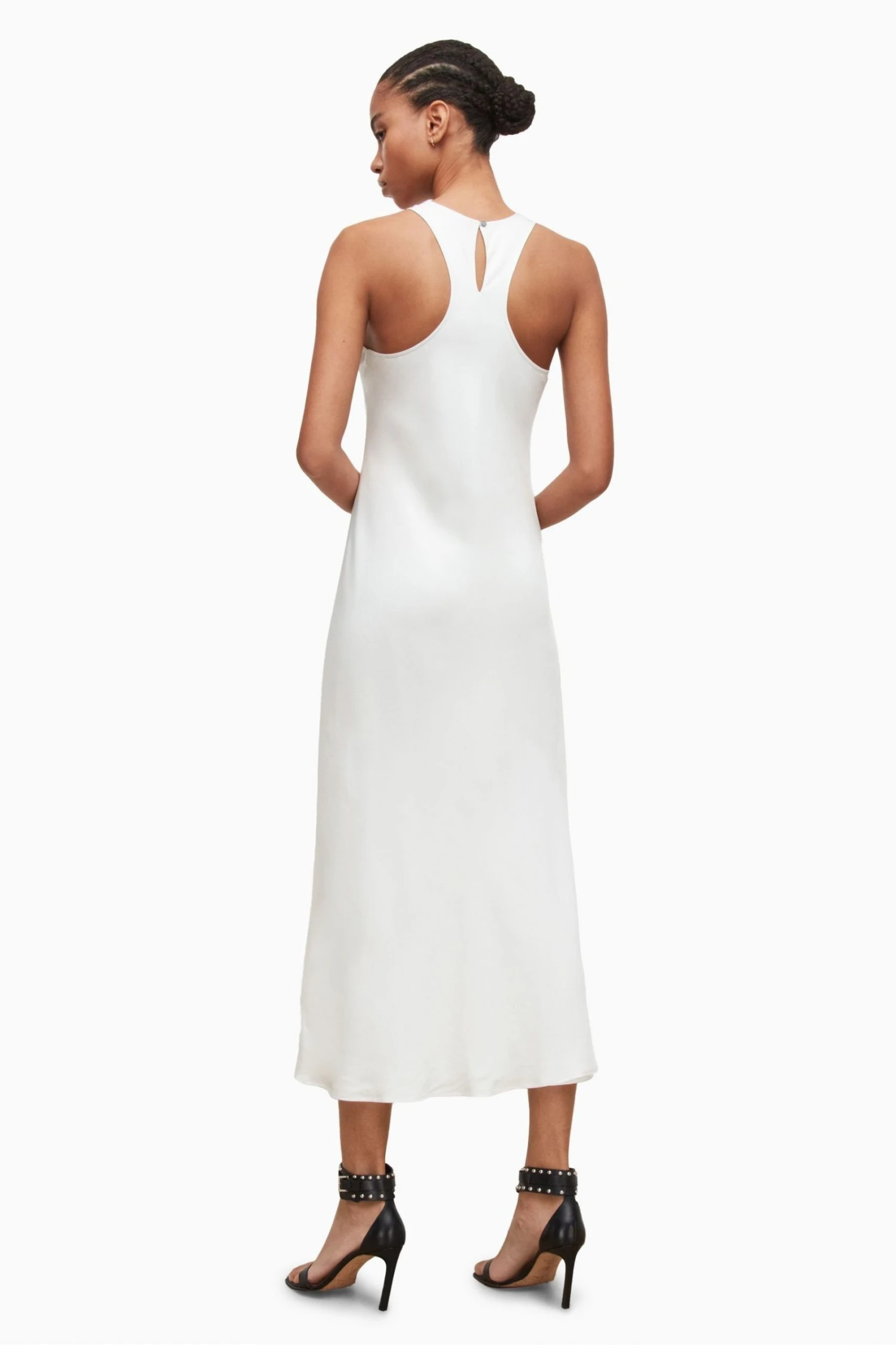 The round neck sleeveless racer neckline slip dress, with long length and buttons. Keyhole with button fastening at back neck and slim fit.
