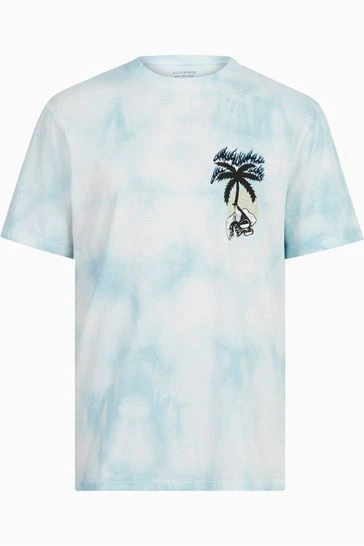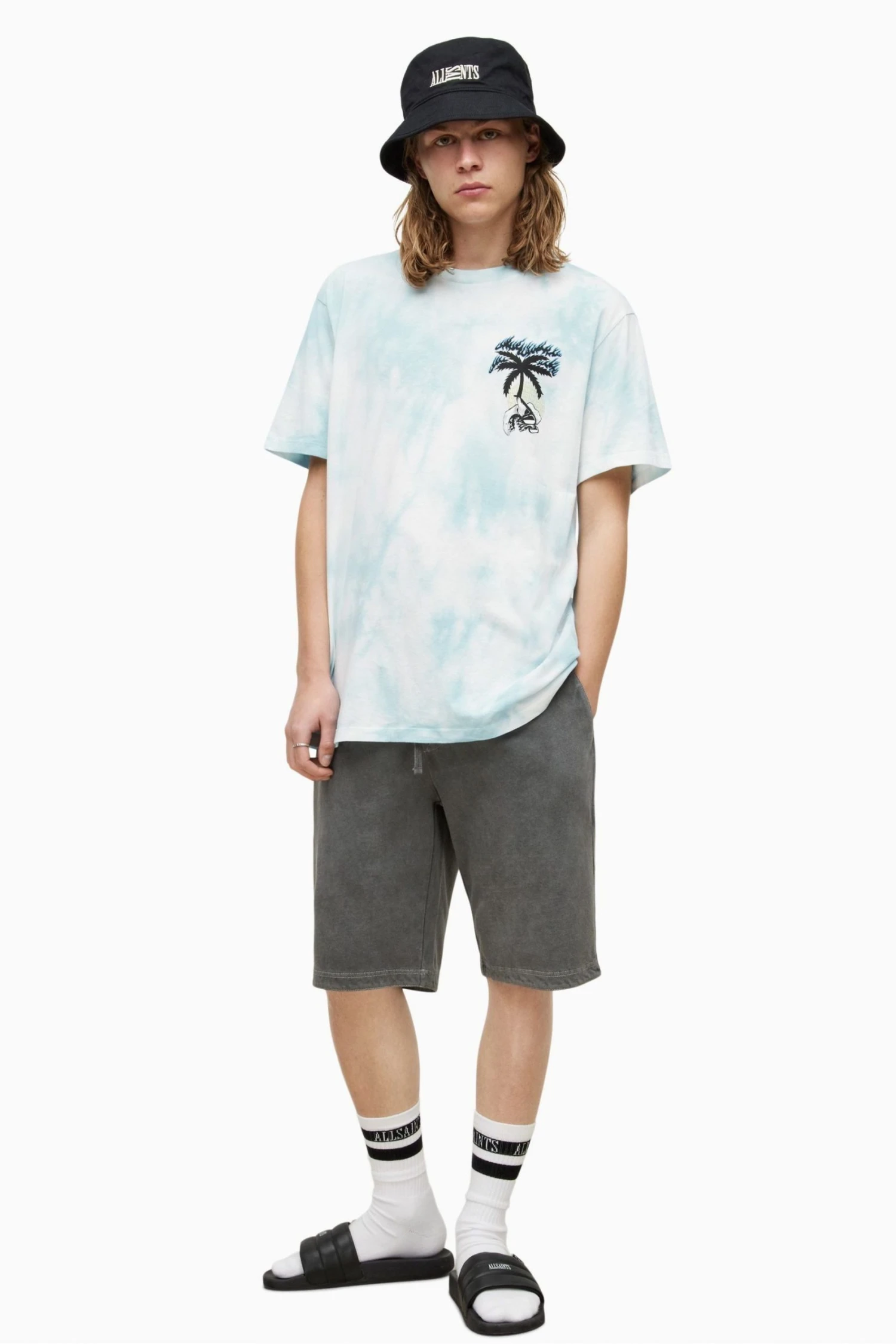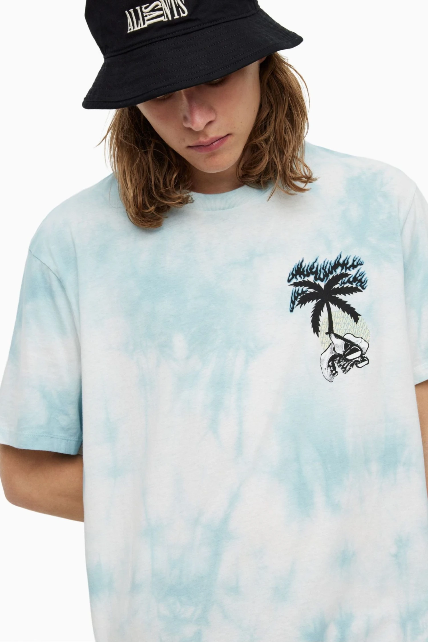Its a relaxed fit pullover with crew neck and short sleeve. Hand drawn skull and palm tree graphic screenprinted front and back.