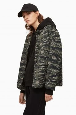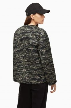 The Hallie Liner Jacket is a welcomed update on classic camo. Featuring our new-season Oniyuri print – it’s hand-painted. Made from sustainable fabrics and cut to a regular silhouette with a diamond quilted texture. Round neck. Button closure. Long sleeves. Two side seam pockets. Diamond quilted. Centre front placket. Lined. New-season Oniyuri print – inspired by Japanese tiger lillies, it’s hand- painted with messages and our store blueprints hidden in the camo. Sustainable EcoVeroâ„¢ viscose. Worn with Talon Hoodie and Juno Cap. Model is 5’10″/178cm and wears size UK 10.