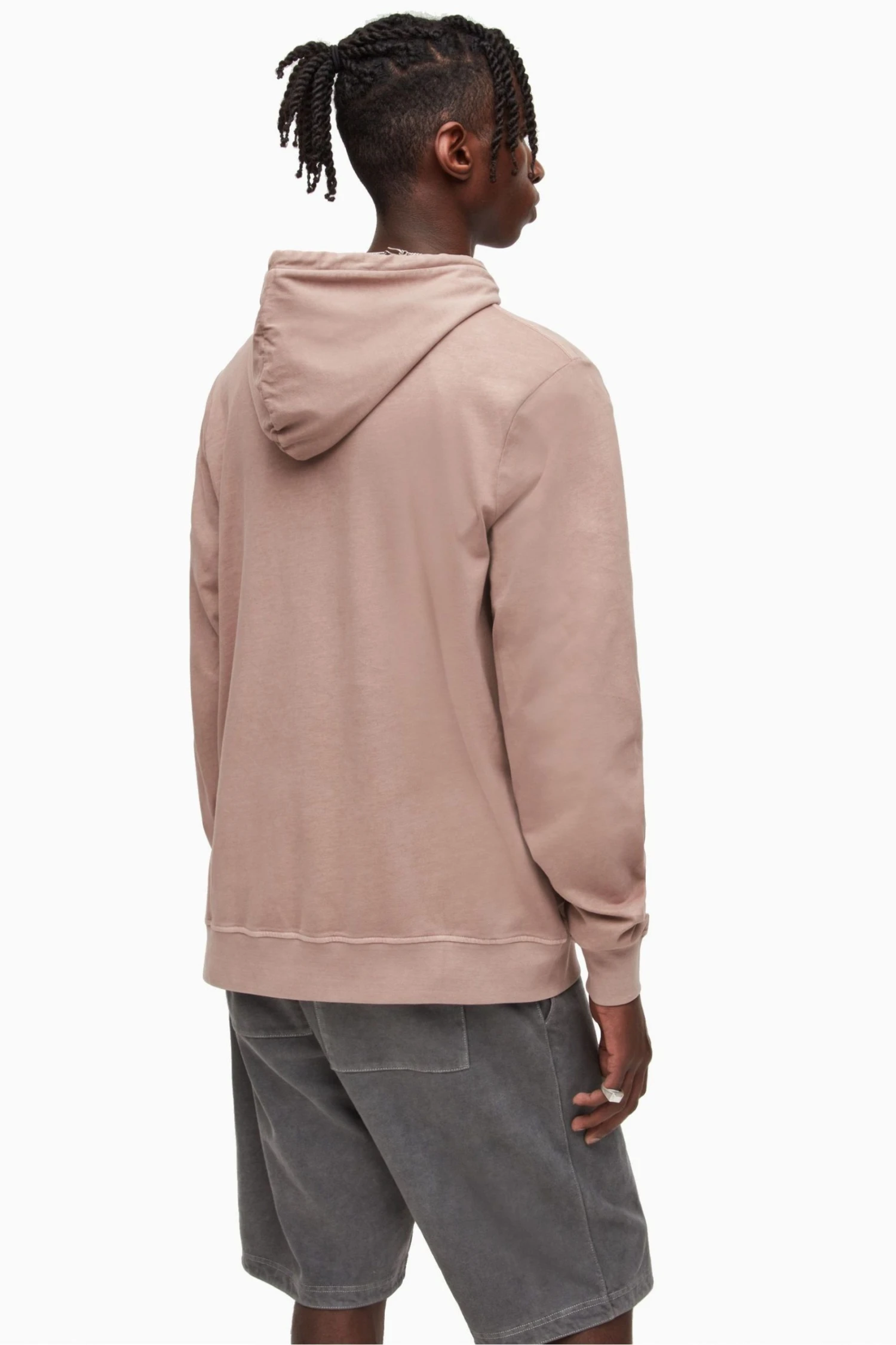 Slim fit pullover hoodie with short sleeves. Ramskull embroidery on left front chest, peached finish on fabric for soft handfeel.